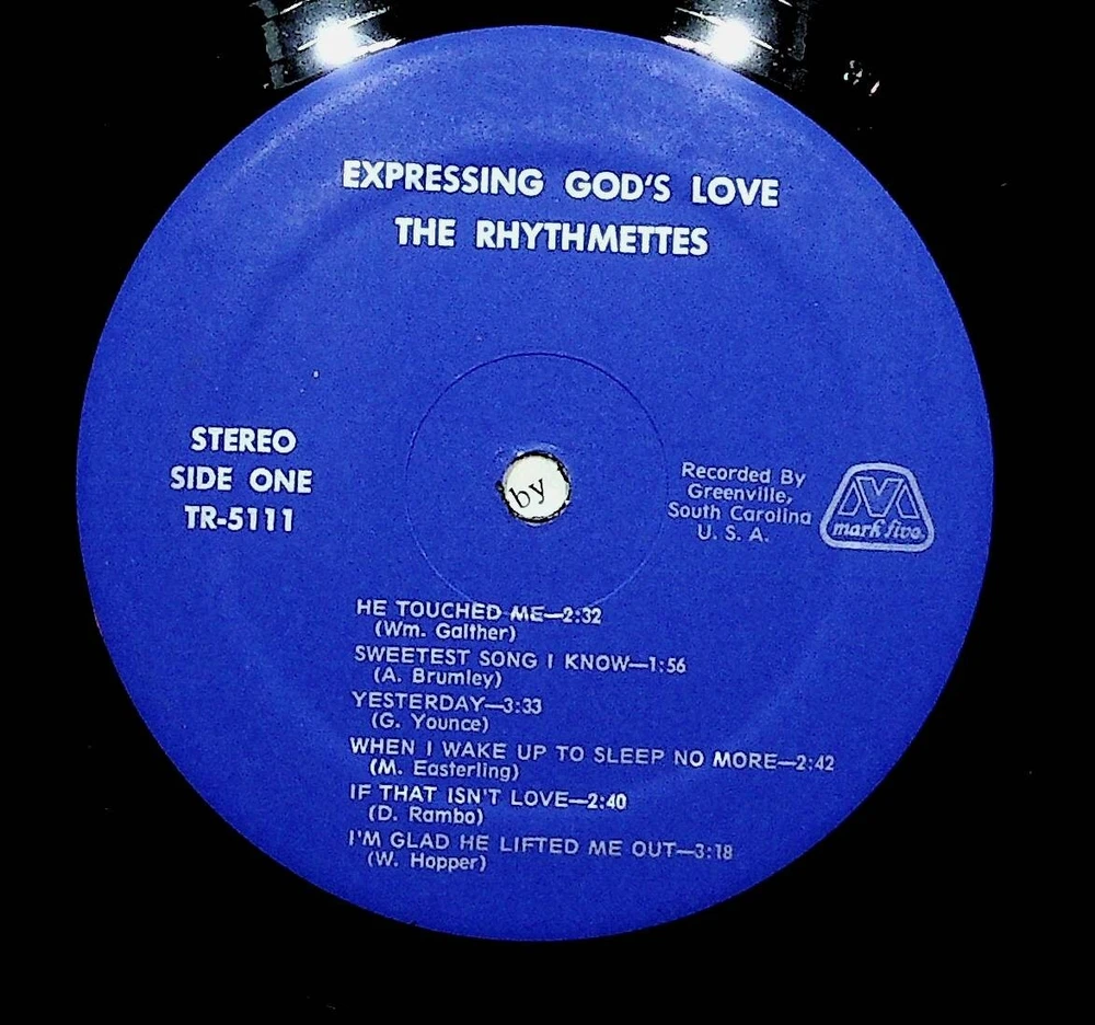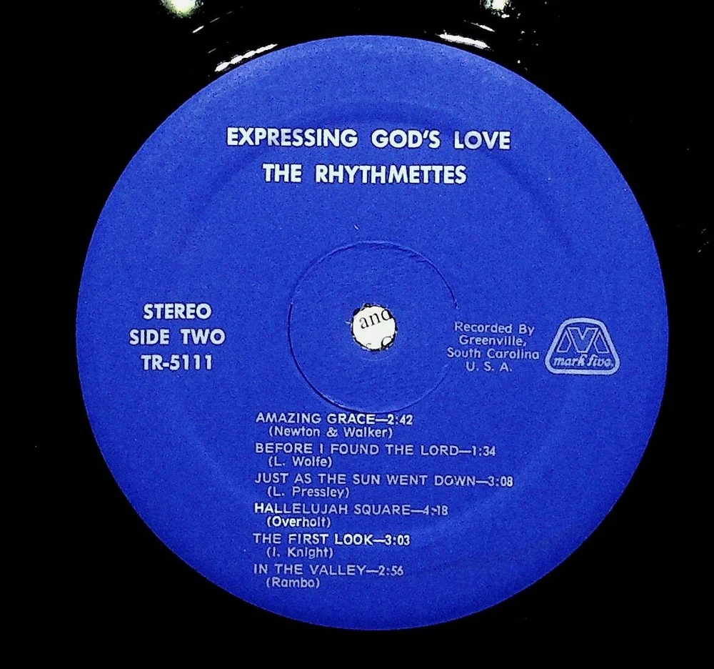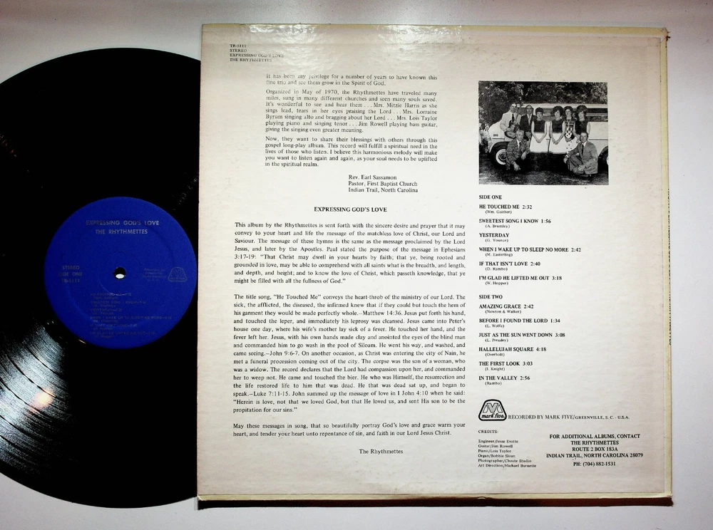 Yes we combine shipping for multiple purchases. Add multiple items to your cart and the combined shipping total will automatically be calculated. The Rhythmettes Expressing God's Love Gospel Christian Vinyl LP Record VG+ Vinyl / Jacket Grade Per Goldmine Standard: VG+ / VG+ SIDE ONE HE TOUCHED ME 2:32 (Wm. Gaither) SWEETEST SONG I KNOW 1:56 (A. Brumley) YESTERDAY (G. Younce) WHEN I WAKE UP TO SLEEP NO MORE 2:42 (M. Easterling) IF THAT ISN’T LOVE 2:40 (D. Rambo) I’M GLAD HE LIFTED ME OUT 3:18 (W. Hopper) SIDE TWO AMAZING GRACE 2:42 (Newton & Walker) BEFORE I FOUND THE LORD 1:34 (L. Wolfe) JUST AS THE SUN WENT DOWN 3:08 (L. Pressley) HALLELUJAH SQUARE 4:18 (Overholt) THE FIRST LOOK 3:03 (I. Knight) IN THE VALLEY 2:56 (Ra mbo) It has been my privilege for a number of years io have known this fine trio and see them grow in the Spirit of God. Organized in May of 1970, the Rhythmettes have traveled many, miles, sung in many different churches and seen many souls saved, it’s wonderful to see and hear them . . . Mrs. Mitzie Harris as she sings lead, tears in her eyes praising the Lord . . . Mrs. Lorraine Byrum singing alto and bragging about her Lord . . . Mrs. Lois Taylor playing piano and singing tenor . . . Jim Rowell playing bass guitar, giving the singing even greater meaning. Now, they want to share their blessings with others through this gospel long-play album. This record will fulfill a spiritual need in the lives of those who listen. I believe this harmonious melody will make you want to listen again and again, as your soul needs to be uplifted in the spiritual realm. Rev. Earl Sassamon Pastor, First Baptist Church Indian Trail, North Carolina EXPRESSING GOD’S LOVE This album by the Rhythmettes is sent forth with the sincere desire and prayer that it may convey to your heart and life the message of the matchless love of Christ, our Lord and Saviour. The message of these hymns is the same as the message proclaimed by the Lord Jesus, and later by the Apostles. Paul stated the purpose of the message in Ephesians 3:17-19: “That Christ may dwell in your hearts by faith; that ye, being rooted and grounded in love, may be able to comprehend with all saints what is the breadth, and length, and depth, and height; and to know the love of Christ, which passeth knowledge, that ye might be filled with all the fullness of God.” The title song, “He Touched Me” conveys the heart-throb of the ministry of our Lord. The sick, the afflicted, the diseased, the infirmed knew that if they could but touch the hem of his garment they would be made perfectly whole.—Matthew 14:36. Jesus put forth his hand, and touched the leper, and immediately his leprosy was cleansed. Jesus came into Peter’s house one day, where his wife’s mother lay sick of a fever. He touched her hand, and the fever left her. Jesus, with his own hands made clay and anointed the eyes of the blind man and commanded him to go wash in the pool of Siloam. He went his way, and washed, and came seeing.—John 9:6-7. On another occasion, as Christ was entering the city of Nain, he met a funeral procession coming out of the city. The corpse was the son of a woman, who was a widow. The record declares that the Lord had compassion upon her, and commanded her to weep not. He came and touched the bier. He who was Himself, the resurrection and the life restored life to him that was dead. He that was dead sat up, and began to speak.—Luke 7:11-15. John summed up the message of love in I John 4:10 when he said: “Herein is love, not that we loved God, but that He loved us, and sent His son to be the propitation for our sins.” May these messages in song, that so beautifully portray God’s love and grace warm your heart, and tender your heart unto repentance of sin, and faith in our Lord Jesus Christ. The Rhythmettes CREDITS: Engineer/Jesse Evatte Guitar/Jim Rowell Piano/Lois Taylor Organ/Bobbie Sloan Photographer/Choate Studio Art Direction/Michael Burnette FOR ADDITIONAL ALBUMS, CONTACT THE RHYTHMETTES ROUTE 2 BOX 183A INDIAN TRAIL, NORTH CAROLINA 28079 Thank you for your business. Gallimoresgoods