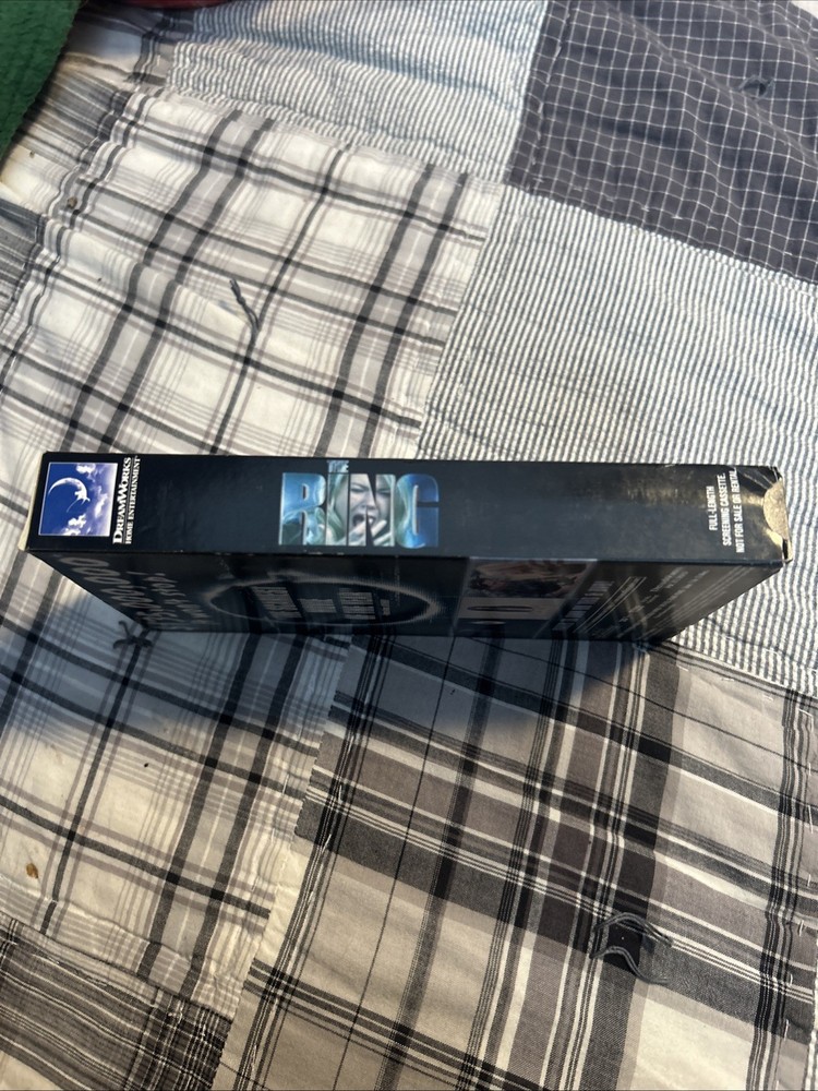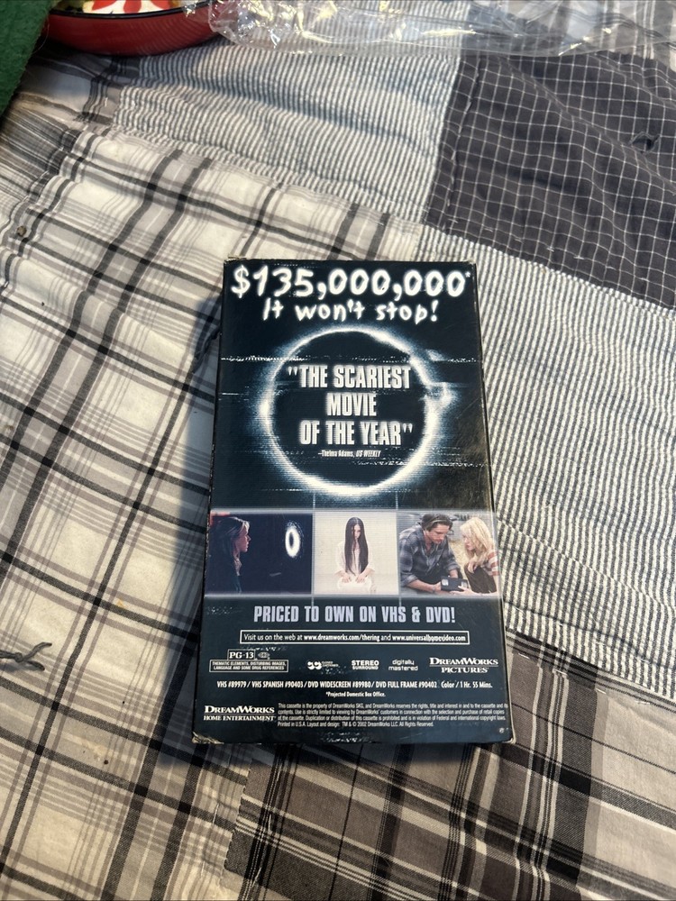 The product is a rare screening VHS cassette of the movie "The Ring" directed by Gore Verbinski and released by DreamWorks Home Entertainment in 2003. The VHS features the English language with NTSC signal standard and is rated PG-13. It does not have a former rental label, making it a sought-after collector's item for fans of horror and cult films. This excellent condition VHS tape provides a unique viewing experience of the iconic horror film "The Ring."
