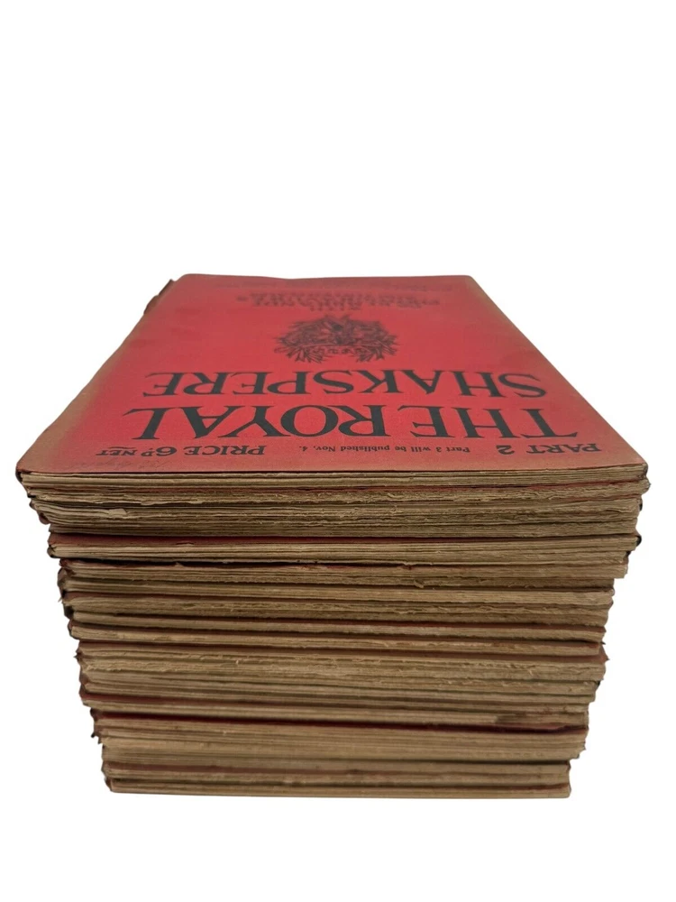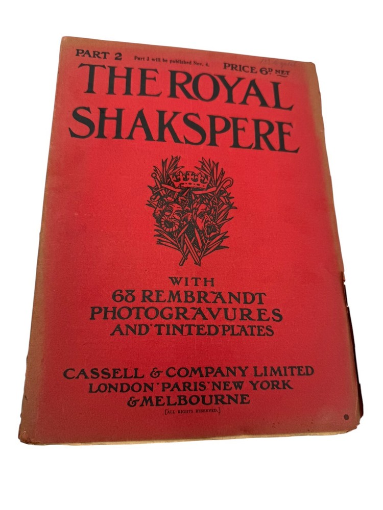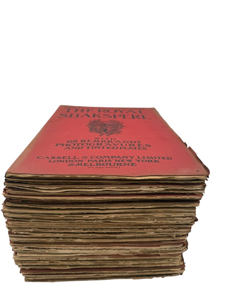 The Royal Shakespeare 1903 Cassell Rembrandt Plates Magazine Shakespeare Works The series has total 34 copies. This collection has FIVE missing copies- Part 16, 22, 23, 25, 27 and 28. Some magazines are in more fragile condition than the others. Most are still bound at top of pages that indicate being unread. Please refer to photos for condition accuracy.