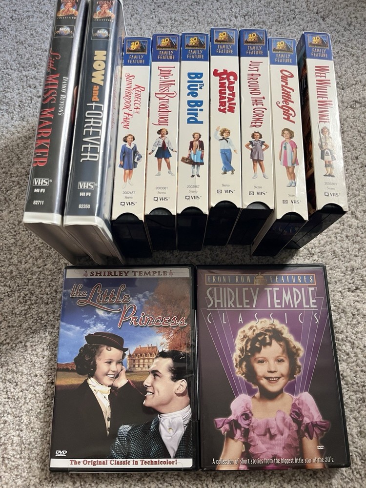 "Remember a time before streaming, when the magic of movies came in a clunky plastic case? We're taking you back to those golden days with this collection of Shirley Temple VHS tapes. Relive the wholesome charm and dazzling talent of Hollywood's original child star. From her iconic tap dances to her heartwarming songs, each tape is a portal to a simpler era. It's more than just a movie; it's a piece of cinematic history and a dose of pure, unadulterated nostalgia. Perfect for collectors, film lovers, or anyone who wants to share a piece of their childhood with the next generation. Pop it in, rewind the past, and let Shirley Temple's timeless joy light up your screen once more." Here are 9 VHS tapes, 2 dvd's plus 1 dvd of the Little Rascals.