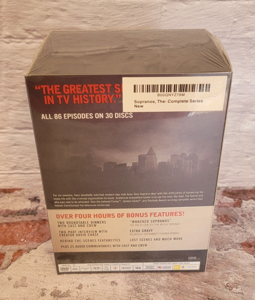 UPC:Does not applyLanguage:EnglishType:TV SeriesSub-Genre:Gangster, Crime/InvestigationRegion Code:DVD: 1 (US, Canada...)Format:DVDSeason:Complete Series Box SetDirector:Allen Coulter, Alan CoulterMovie/TV Title:The Sopranosgtin13:Does not applyEdition:Box SetGenre:Drama