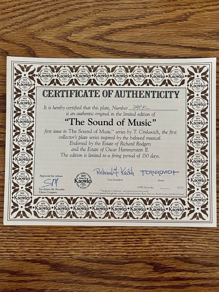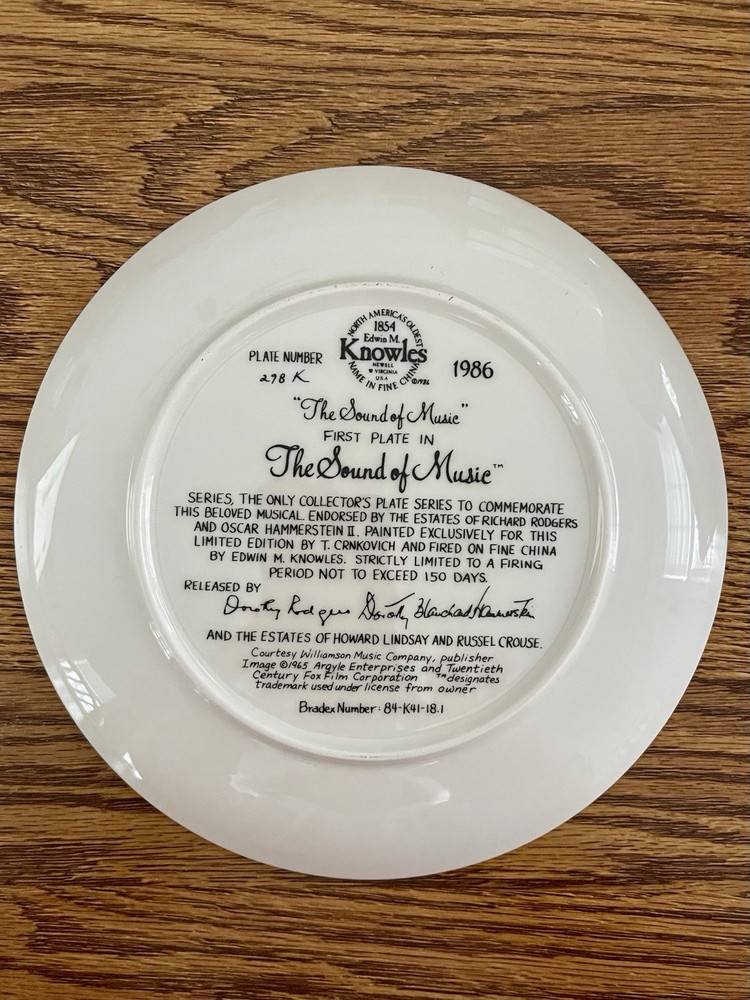 The "The Sound of Music" collector plate is an 8.5" fine china wall plate produced by Edwin M. Knowles in 1986. This Americana-themed plate features a multicolor design and is part of the art pottery style production technique. This decorative collectible showcases a scene inspired by the beloved musical, The Sound of Music starring Julie Andrews, making it a unique and nostalgic addition to any collector's display.