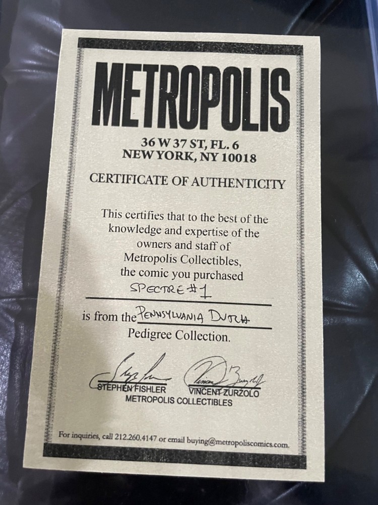 Amazing pedigree copy of Spectre 1. It’s fantastic. I have it at 9.0. Only issue I see is slight color break on the bottom right and near the top. Back is perfect, white pages. Awesome pedigree, great story.