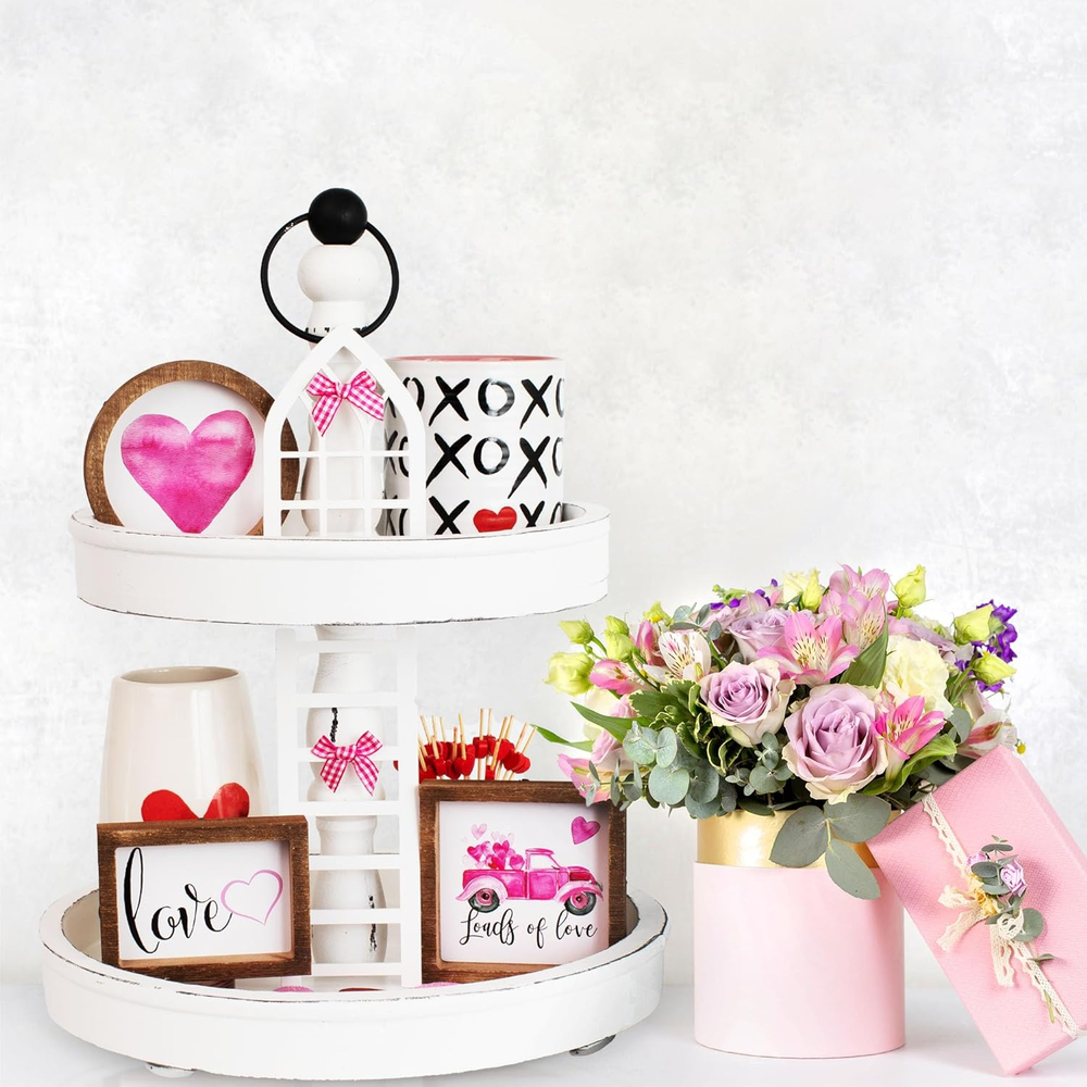 The Ultimate Tiered Tray Decor Set (PRINTS STORED INSIDE FRAMES / TIERED TRAY NOT INCL.): Your all-in-one tiered stand set - seasonal decorating made easy! The set offers you everything you need to decorate your tiered tray all year round and in style - 3 different sized frames (incl. a round one), 15 beautiful seasonal prints tiered tray decor, a ladder, an arched style window, 16 bows in 8 different colors The Perfect Farmhouse Decor Match For Any Season: Changing seasons is an excellent reason to spruce up your decor - with the large set you are well prepared to make your seasonal decoration a hit. With 30 prints in total for 10 seasons, it guides you from Valentine’s Day & St. Patrick's day, Easter, spring, 4th July, summer & fall decorations to halloween and Christmas vibes, plus some all-time-favorite “home” designs Adorable Home Decor in Farmhouse Style: Modern farmhouse decoration by KIBAGA - a lovely addition to any home decor! White pieces, rustic wooden elements and pretty prints with lovingly designed lettering and graphics - the seasonal tiered stand decor makes for a wonderful centerpiece in your home decor, whether for spring, Easter or winter Numerous Ways To Decorate Your Home: Adapted by look and size to the tiered tray stand, you can use the deco items just as beautifully as stand-alone decoration around your home, e. g. embellish the ladder with a colorful bow and put it on your bookcase, add a “home sweet home” frame to your living room and a seasonal print to your coffee table or bathroom All Prints are stored inside the Frames (Stand not incl.). A Heartfelt Gift For A Loved One: What a gorgeous gift for a housewarming, birthday or a wedding! The tiered stand decor set is truly a thoughtful gift that makes your family & friends house a home! Beautiful farm decoration set with tiered trays, prints stored on the inside of the frames / step tray not included. - Now you are covered for your elegant seasonal home decor. Whether you want to set the festive mood in your home decoration at Easter or Christmas, or organize a Valentine's Day or Halloween party and spice up the decoration, the tiered tray decoration set is the perfect decoration for your home. Show your choice of variation, you can choose from a complete set of options. Best of all, since there are 15 double-sided prints with 30 different designs for a total of 10 seasons, you can change the print as you like and it will never get boring and add a fresh touch to your decor for years. The beautiful tiered tray decoration set includes: 3 frames, 1 ladder, 1 arch window, 16 bows (8 different colors), 1 double-sided sticker. 3 prints for Valentine's Day, St. Patrick's Day, Easter, Spring, 4th of July, Summer, Autumn, Halloween, Christmas and favorite designs "home" all year round. Simply perfect decoration for any season, all in elegant farm charm. The decorative items look fabulous on your step tray, but also make a wonderful freestanding decoration around your home. Add the small patterned frames to your coffee table or bring some seasonal vibes to your hallway or bathroom. The decor set looks great in any home, use it as a sincere gift for housewarming, birthdays or even for a wedding. What joy! Our enthusiasm for beautiful seasonal decorations is blooming. Are you ready to start? Note: the tiered storage compartment is not included in this set