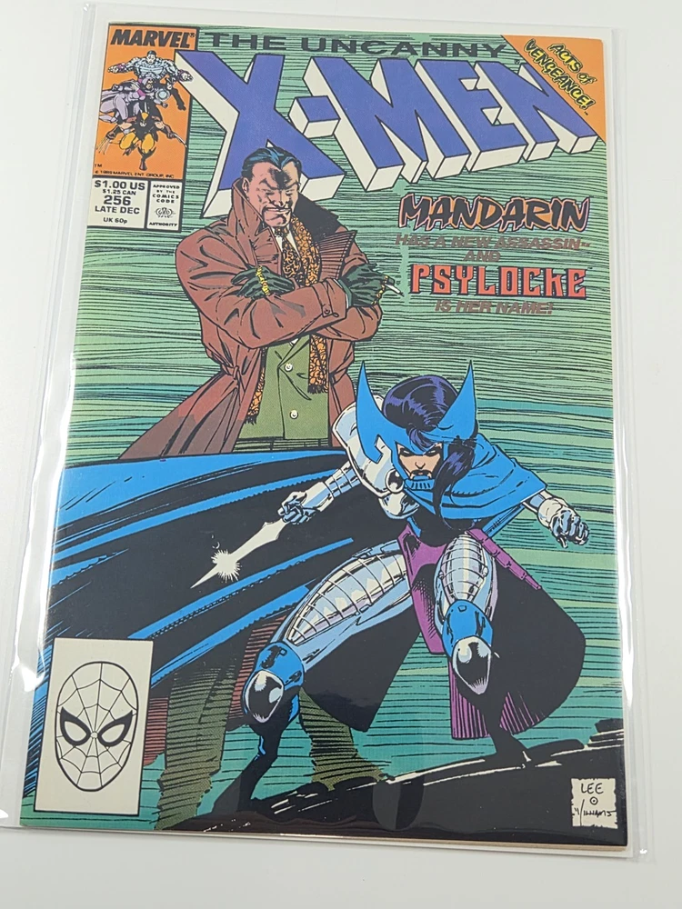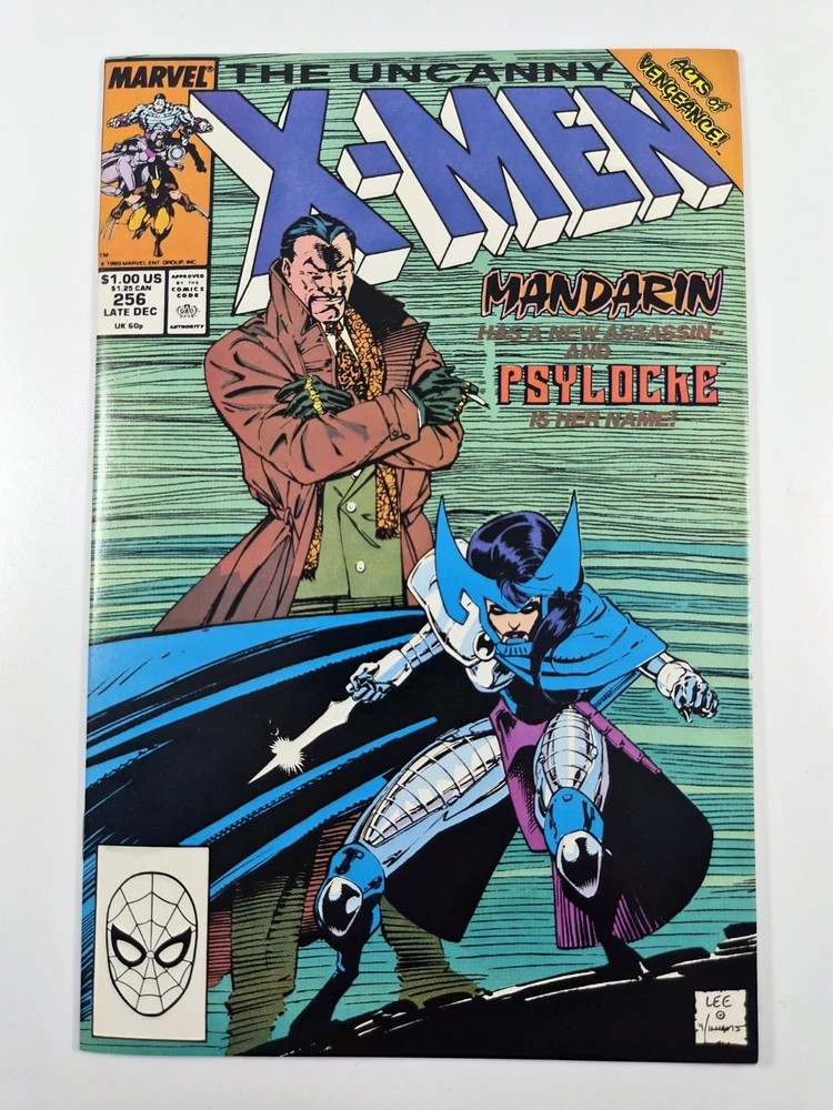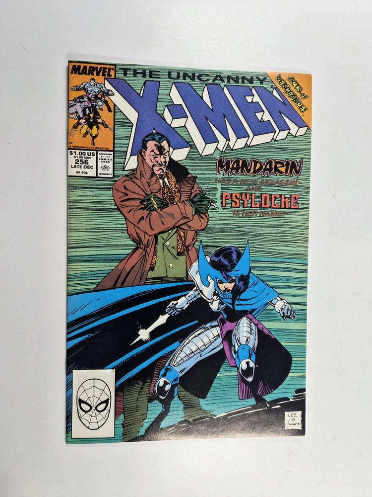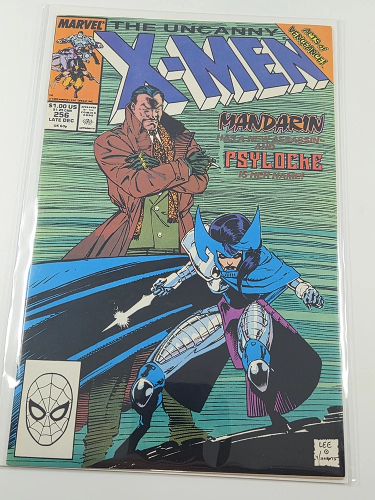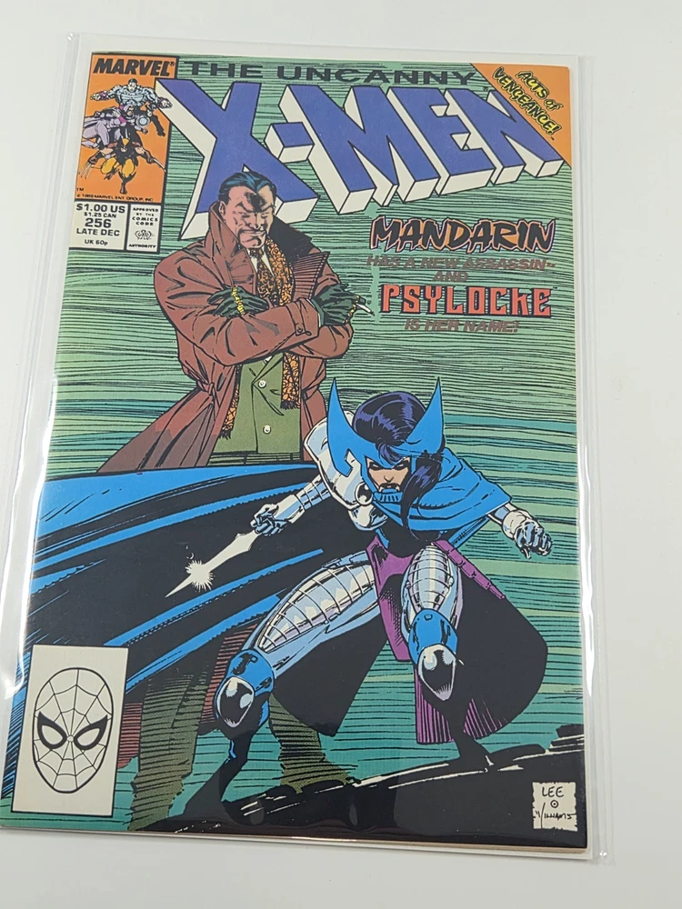 The product is a vintage single issue comic book titled "The Uncanny X-Men #256" from 1989, featuring the 1st appearance of the character Psylocke in stunning artwork by Jim Lee. This US comic from Marvel Comics showcases the iconic X-Men superhero team, with a colorful style and boarded features. The comic, written by Chris Claremont and illustrated by Jim Lee, is a valuable addition to any collector's library, especially for fans of the Marvel Universe and superhero genres.