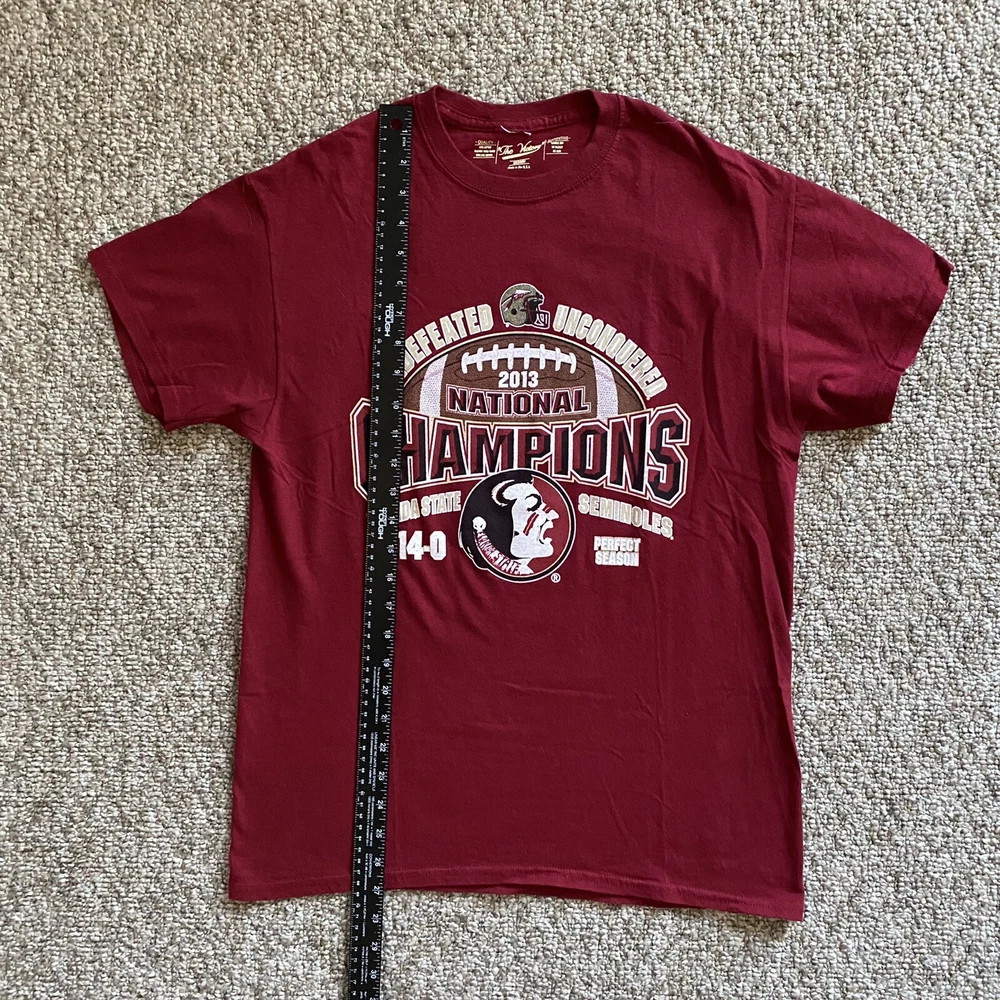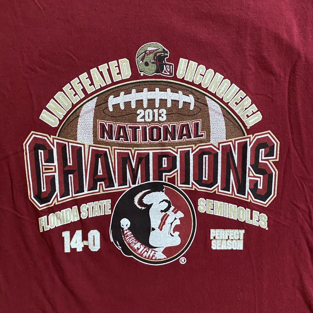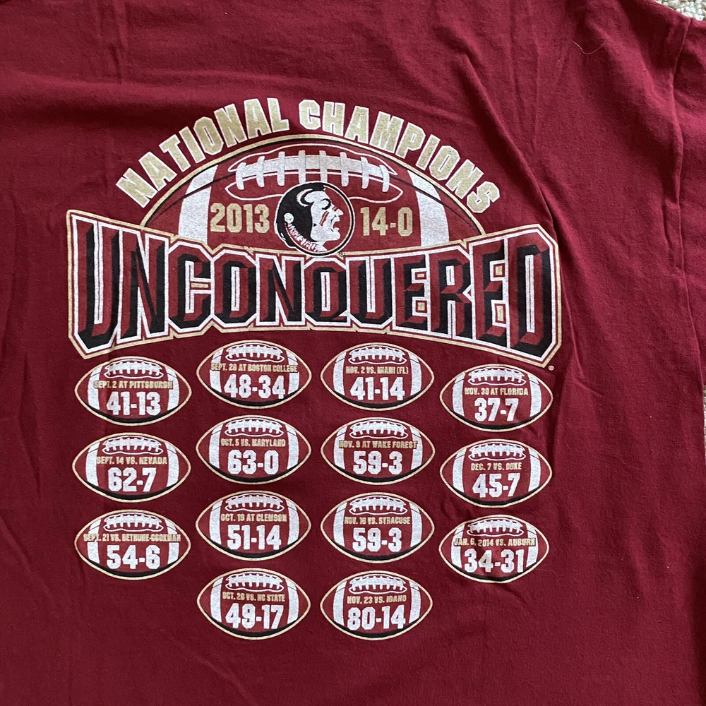 Length/Pit to Pit: 27”/19” Excellent used condition. No stains or tears. Colors are bright and vivid. All graphic prints are in flawless condition with no signs of distress. A fabulous throwback retro piece commemorating that Undefeated Championship Season in 2013. Big logo and spell out on the chest and the game scores on the back. Item is sold As Is; Item in pictures is the item you’ll receive. Thanks for looking and be sure to check my store as I list items daily. Please see photos for condition and measurements. Items are cleaned per eBay requirements, no fresheners or scents used. Stored in a smoke free environment.
