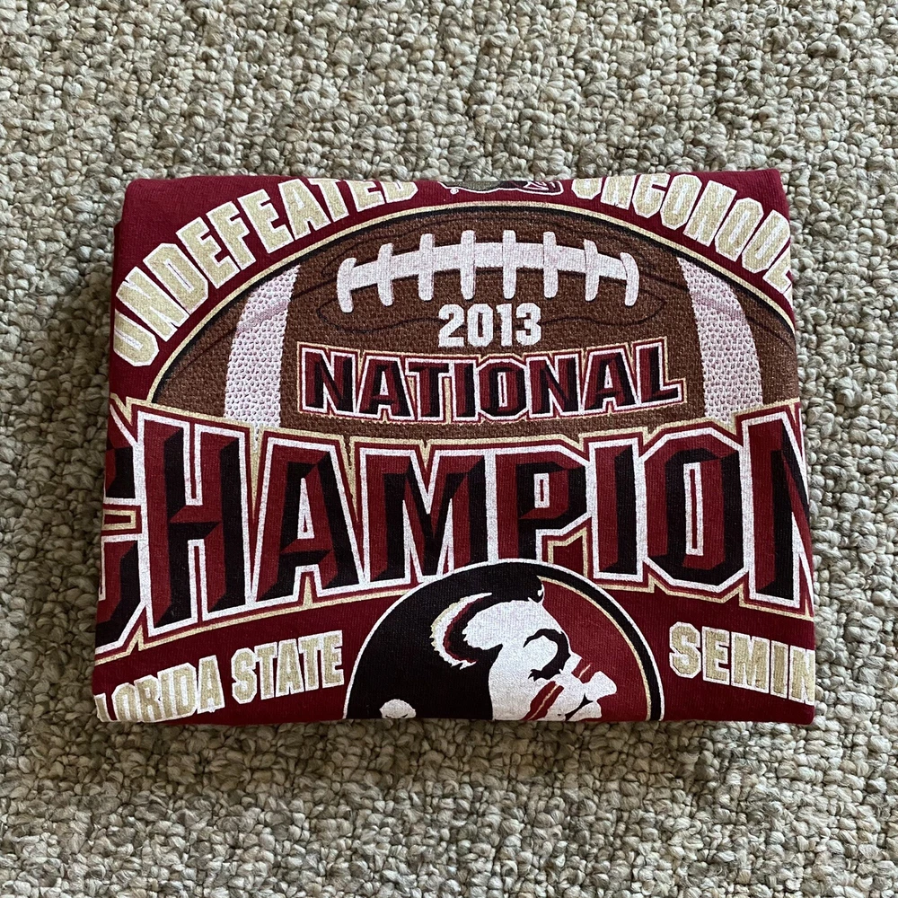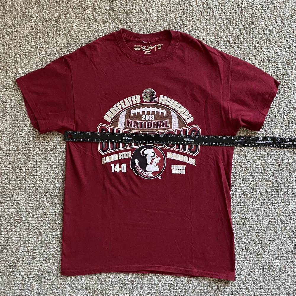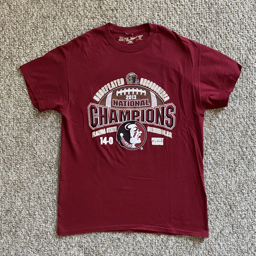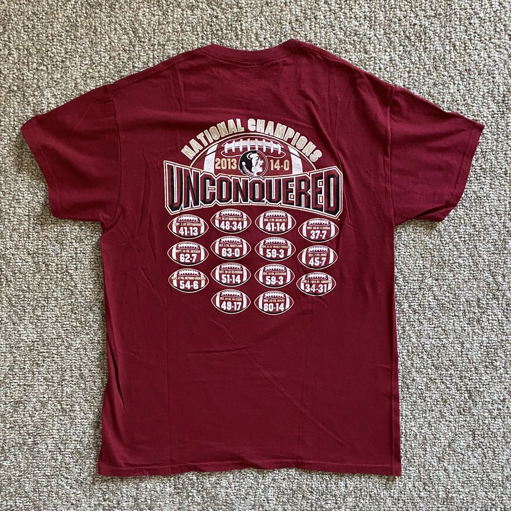 Length/Pit to Pit: 27”/19” Excellent used condition. No stains or tears. Colors are bright and vivid. All graphic prints are in flawless condition with no signs of distress. A fabulous throwback retro piece commemorating that Undefeated Championship Season in 2013. Big logo and spell out on the chest and the game scores on the back. Item is sold As Is; Item in pictures is the item you’ll receive. Thanks for looking and be sure to check my store as I list items daily. Please see photos for condition and measurements. Items are cleaned per eBay requirements, no fresheners or scents used. Stored in a smoke free environment.