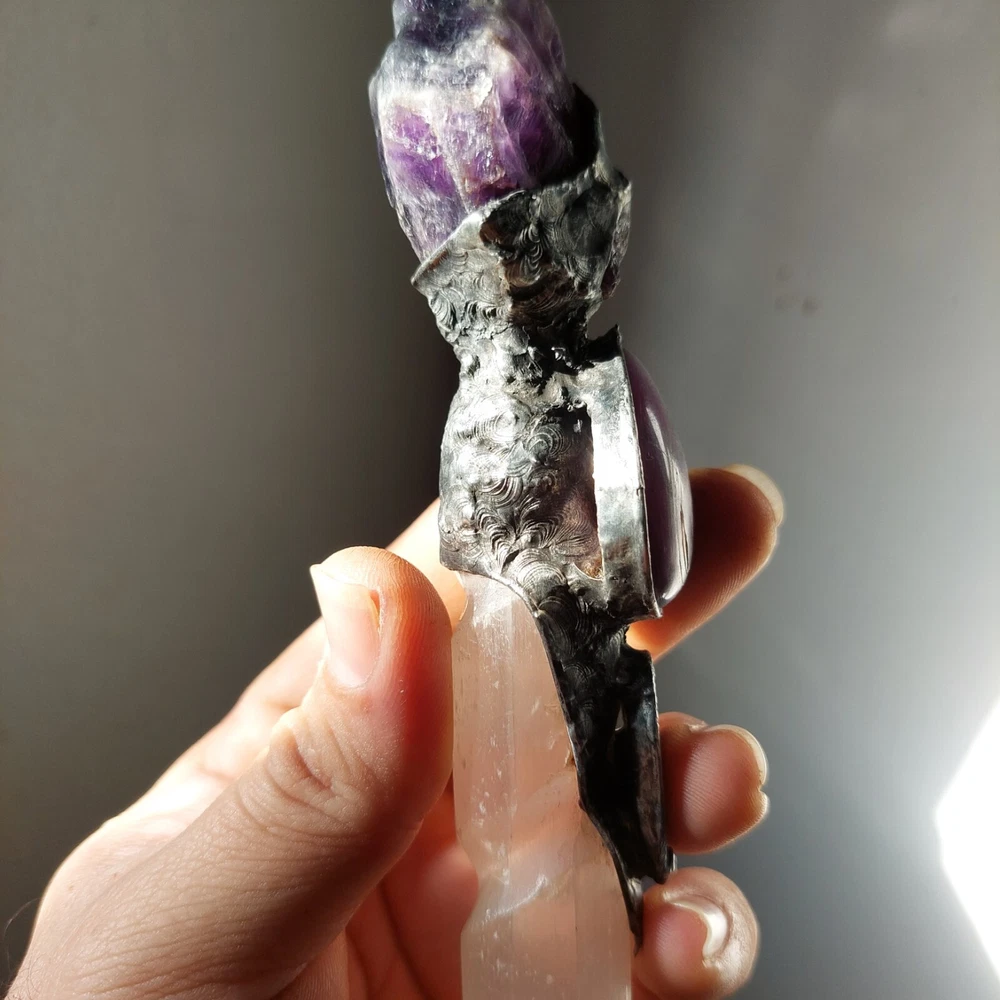 This is a gorgeous powerful healing purple wand for a high-priestess featuring, high-quality Gem Lepidolite, Purple Labradorite, dream amethyst on its crown on a satin spar(selenite) unicorn spiral horn, measures approximately 9-10". Jewelry is handcrafted with led free silver solder with a method called tiffany technique, using black patinas and a final polish to create an antique ancient magical feel to it. Wands are effective when working on the energetic and etheric levels of the body. The simplest way to work with wands on this level is to activate and balance the 7 chakra system. There is no physical contact with the body in this method so it is a great introduction for someone who is not used to energy work. Starting at the base chakra, spiral the wand in a clockwise motion to activate and balance this centre. Continue until you feel this chakra is balanced and move on to the next one until you have balanced all 7 chakras. This is a very simple yet effective way to use crystal wands to balance the body. Wands are also used to cast spells, create psychic shields, enhance or enchant jewelry and other objects. They may also be helpful in removing and destroying astral parasites, demons, and archons. You can deflect dark magic, curses or hexes and protect yourself from evil eye and evil witchcraft or evil entities, amongst many other useful magical deeds. Amethyst is a powerful and protective stone. It guards against psychic attack, transmuting the energy into love and protecting the wearer from all types of harm, including geopathic or electromagnetic stress and ill wishes from others. Amethyst is a natural tranquiliser, it relieves stress and strain, soothes irritability, balances mood swings, dispels anger, rage, fear and anxiety. Alleviates sadness and grief, and dissolves negativity. Amethyst activates spiritual awareness, opens intuition and enhances psychic abilities. Sometimes known as the lucky stone, satin spar brings good fortune to the bearer. It is a powerful calming stone that helps to clear confusion and brings clarity to the mind. It is extremely cleansing and never needs to be cleansed. A stone of transformation, Labradorite is a useful companion through change, imparting strength and perseverance. It balances and protects the aura, raises consciousness and grounds spiritual energies. Excellent for strengthening intuition - promoting psychic abilities. Powerful in revealing the truth behind illusions, Labradorite banishes fears and insecurities, and strengthens faith in the self and trust in the universe. It stimulates the imagination and calms an overactive mind, developing enthusiasm and new ideas. A “stone of transition”, Lepidolite assists in the release and reorganisation of old behavioural and psychological patterns, gently inducing change. It brings deep emotional healing, soothing and reducing stress and depression. Lepidolite dissipates negativity and insists on being used for the highest good. It activates the throat, heart, third eye chakras and the intellect. It opens the crown chakra, clearing blockages and bringing cosmic awareness. Lepidolite facilitates astral travel and accesses the Akashic Record. It helps to take you forward into the future, tuning you in to thoughts and feelings from other lives that are creating a blockage in your life now.