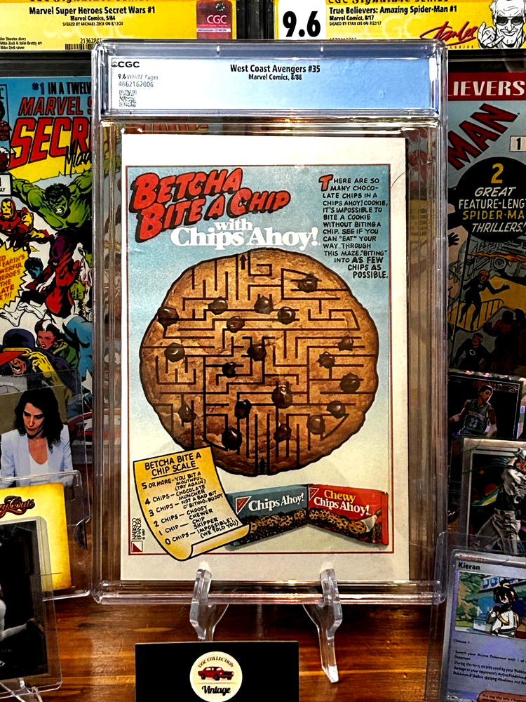 The West Coast Avengers #35 is a single issue comic book featuring key characters from the Avengers superhero team, including Doctor Doom (Kristoff Vernard). This 1988 publication by Marvel Comics is part of the West Coast Avengers series and is graded at 9.6 by CGC. With artwork by Al Milgrom and a story titled "The Voice of Doom," this English-language comic from the Copper Age is a valuable collectible for fans of superheroes and US Comics. Key Facts: Cover art featuring Doctor Doom.