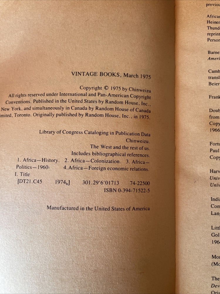 Discover the captivating book "The West and the Rest of Us: White Predators, Black Slavers and the African Elite" by Chinweizu, published by Knopf Doubleday Publishing Group in 1975. This trade paperback is a must-read for history enthusiasts and those interested in Africa, as it explores the topic of slavery and the African elite. With a weight of 15 oz, this book is perfect for travel or leisure reading. The language is in English, and it falls under the genre of non-classifiable and history. Don't miss out on this fascinating read that will expand your knowledge on the topic of Africa and slavery.