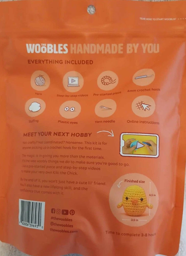 The Woobles Learn to Crochet Kit for Beginners Kiki The Chick All materials included: Yarn, Pre-started piece, 4 mm crochet hook, stuffing, plastic eyes, yarn needle, instructions