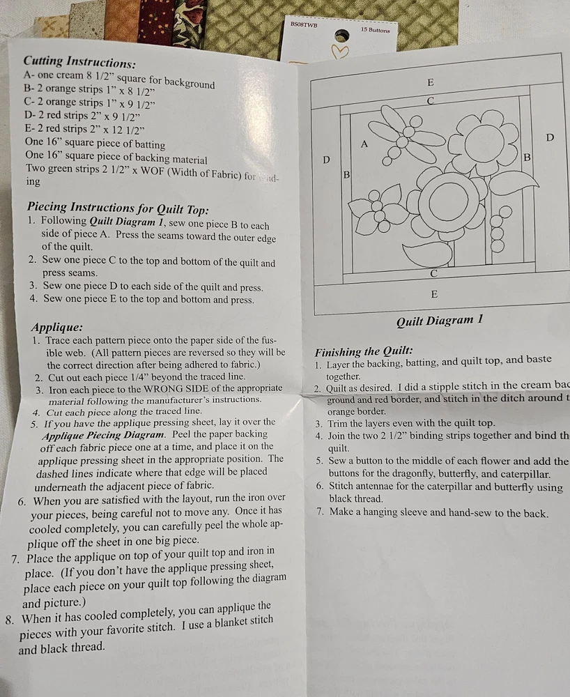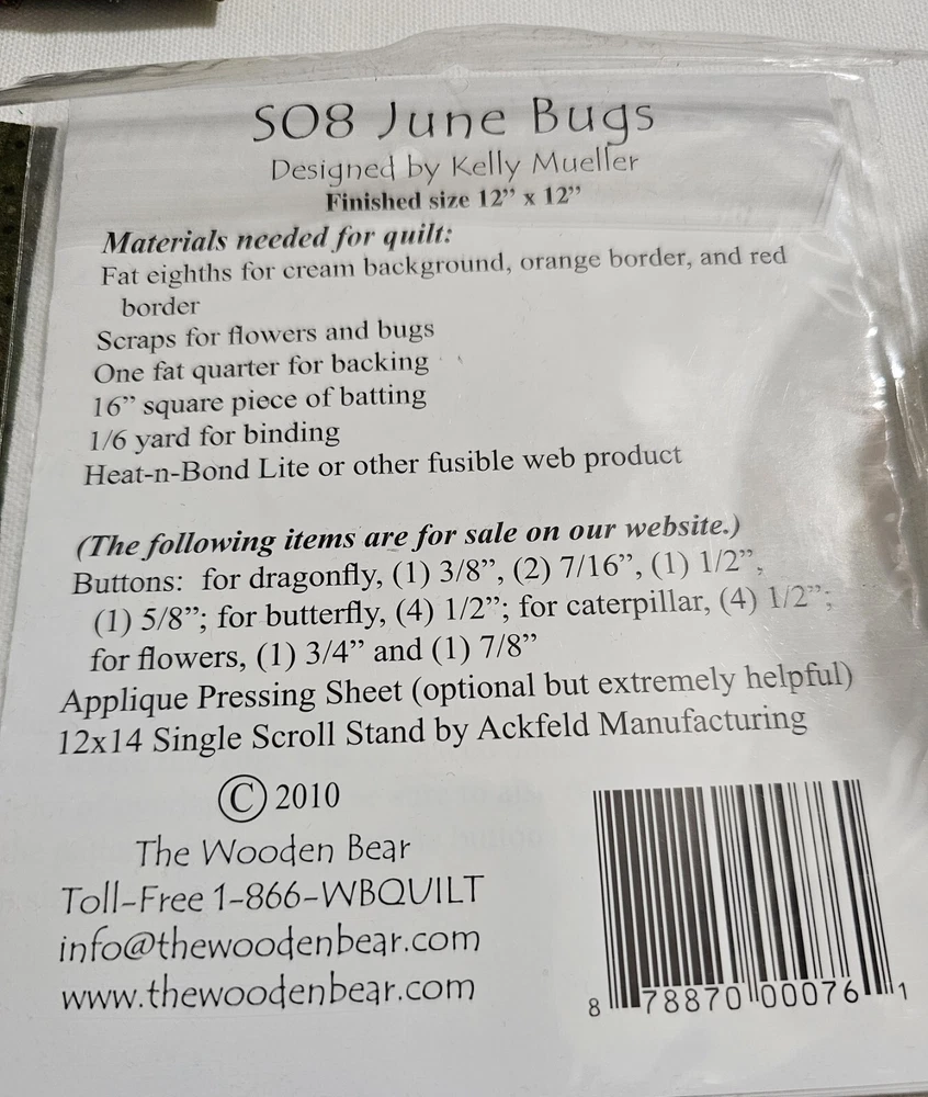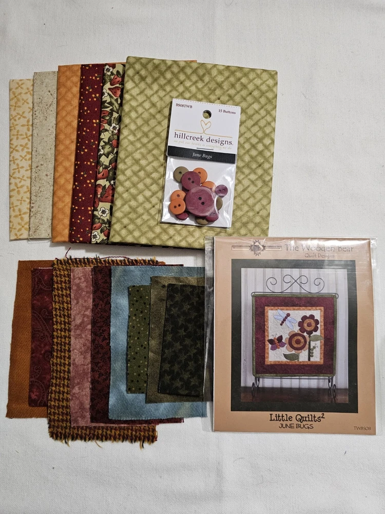 The Wooden Bear Quilt Designs Little Quilts 2 June Bugs Quilt kit. Finished size 12x12. Designed by Kelly Mueller. Instructions and fabric included. Returns accepted within 30 days in same condition as purchased. Buyer pays return shipping. Shipping USPS ground.