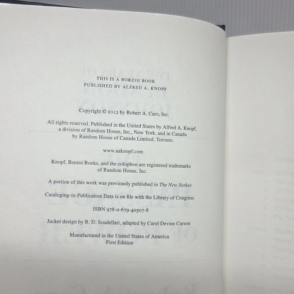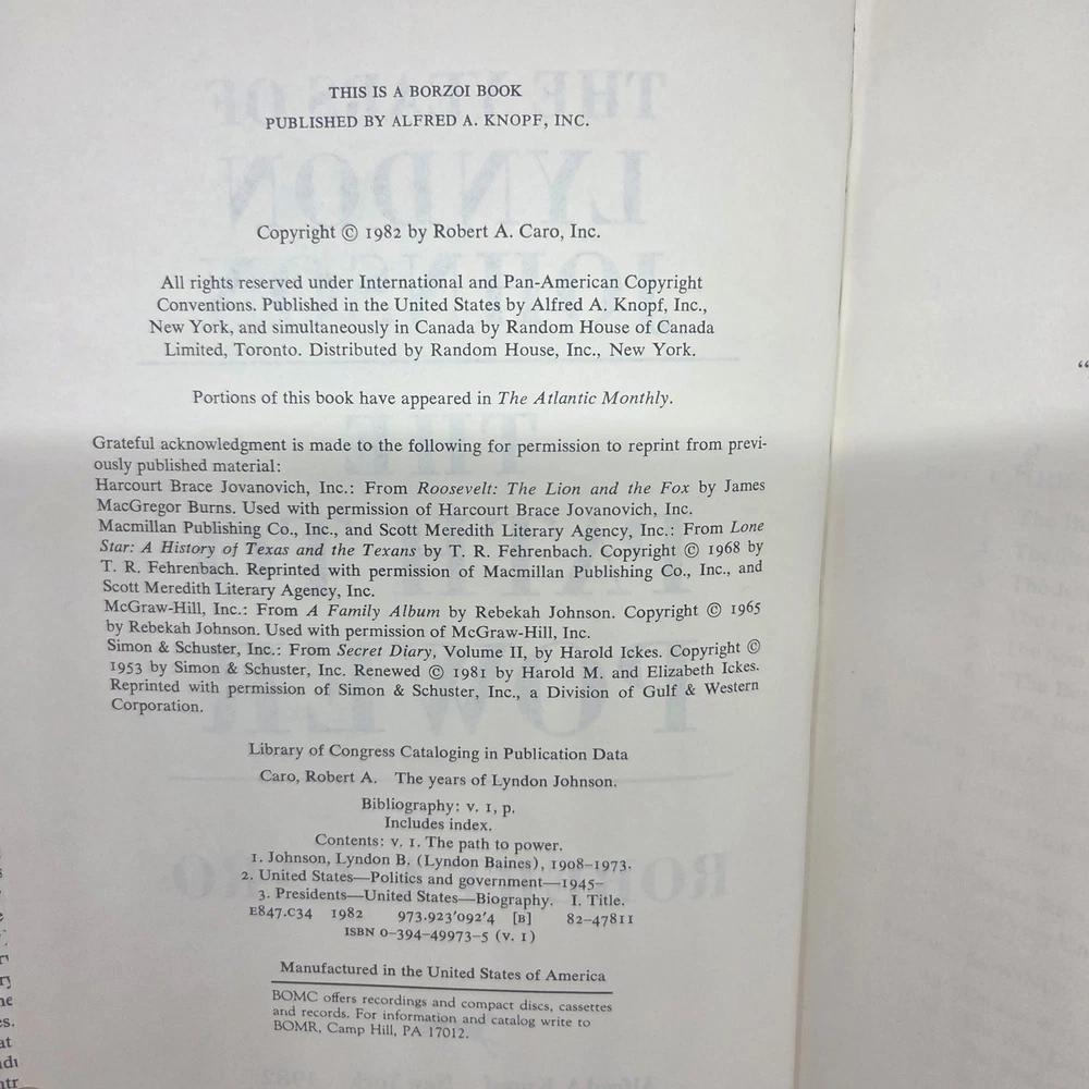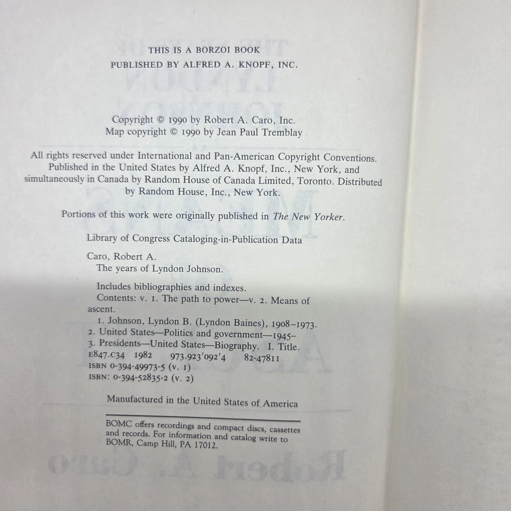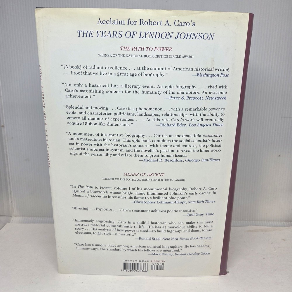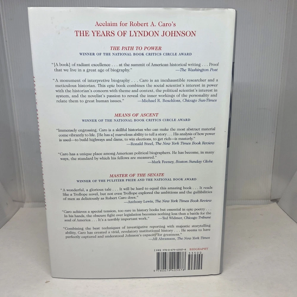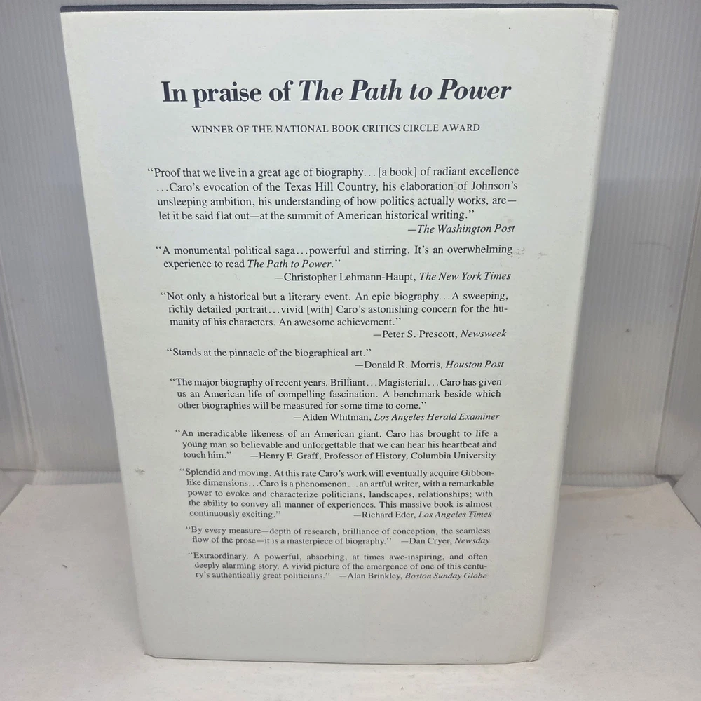 Here is an easy purchase for anyone interested in this subject. All four, the complete set, of the Years of Lyndon Johnson Series by Robert Caro all in one place! Book 1 - The Path to Power - 1982 ( original copyright year) but not stated as first edition. Book 2 - The Means of Ascent - 1990 Copyright - Possibly a Book of the Month edition. Book 3 - The Master of the Senate - 2002 original copyright, third reprint in 2002 Book 4 - The Passage of Power - 2012 - stated first edition Please see all photos for condition. The detailed info in this listing is for the first book, The Path to Power. There was not enough room for details on all four books. If you need any additional details, don't hesitate to ask. All customers enjoy fast shipping, with all orders being shipped same or next day. Carefully packaged to arrive in same condition as pictured. Feel free to ask questions. New inventory is added regularly. Please browse WHISPERING PINES BOOKSTORE soon!