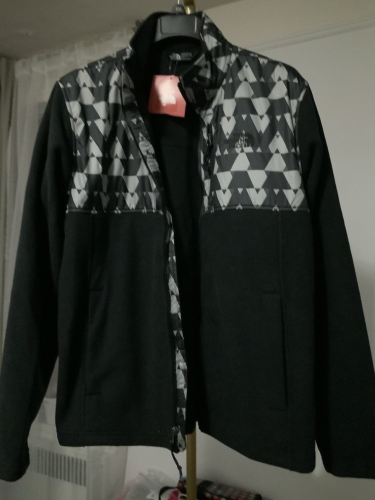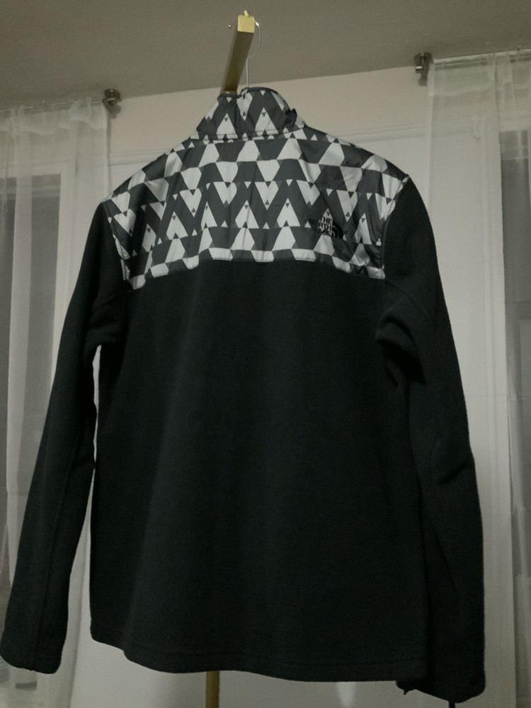 The north face jacket features a modern black design with a gray geometric patterned upper panel and embroidered logo on the chest.full zip front closure,soft,comfortable interior,zippered chest pocket,side hand pockets for secure.lightweight and warm.