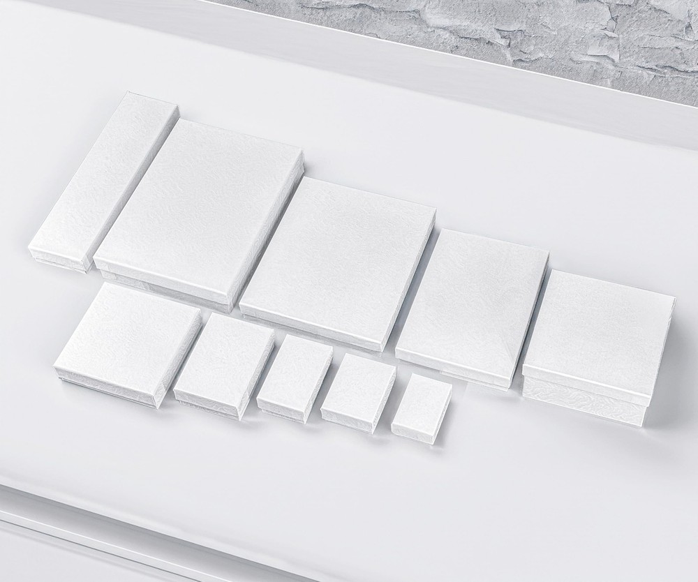 Specification: Package Quantity: 100 Boxes Color: White Swirl Size: #21 Outer Dimension: Approx. 2 5/8" x 1 5/8" x 1" Inner Dimension: Approx. 2 7/16" x 1 7/16" x 7/8" Usage: Rings, Charms, Pendants, Beads, Earrings, Small USB Drive, etc. Note: This size fits 2 quarters side by side comfortably. Important: For size reference, please refer to the 2 size chart images above. If you have any questions or concerns regarding fitment, please feel free to reach out to us at anytime. 100% Brand new, made by top quality cardboard paper. 100 boxes per order. Variety of sizes you can choose. Matte White with Embossed Swirl Pattern. Outer Dimension: 2 5/8" x 1 5/8" x 1" - Inner Dimension: 2 7/16" x 1 7/16" x 7/8". This size fits 2 US Quarters side by side comfortably. Great for Earrings, Rings, Charms, Pendants, Beads, Small USB Drives, etc. An Affordable & Reliable Option for Storing, Organzing, Displaying, Gifting, Packaging and Shipping Jewelry and other Small Items. Stronger walls for more protection & are suitable for shipping. Fuller cotton fill protects item from scratches and impact.