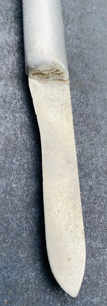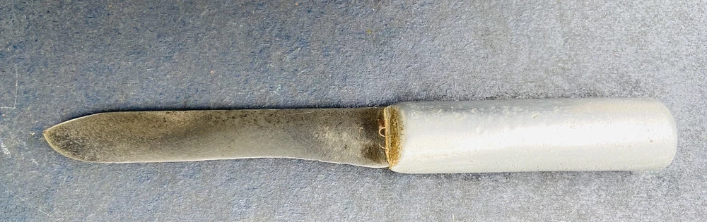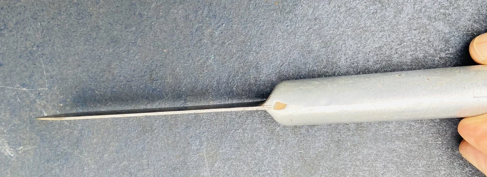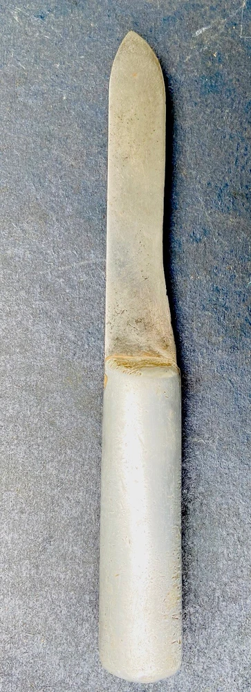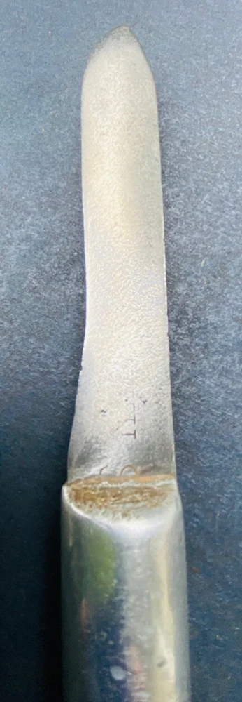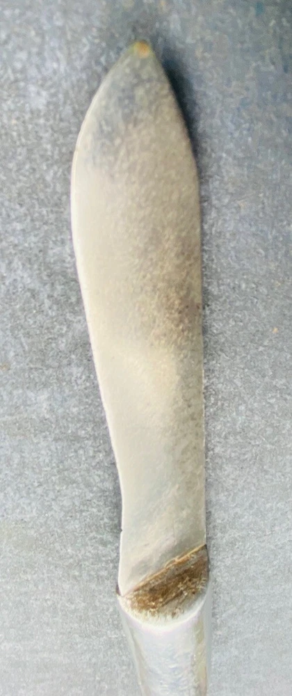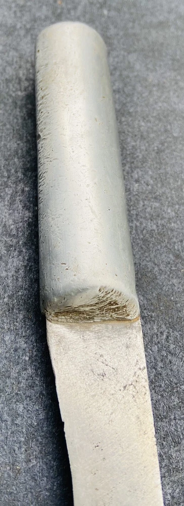 This hefty little theater made knife incorporates a 4 3/8” carbon steel blade from what was another factory made blade. The OAL is 8”. The blade has essentially no flex. It is moderately sharp. The crudely cast aluminum handle mostly obscures what looks like a large letter “S”. There are some mostly worn other letters on the blade flat, to the left of the “S”. You should be able to see what I am talking about in the second photo. Please examine the photos, a part of this description. Ask any questions. I have been an eBay seller for 24 years. Your satisfaction matters !