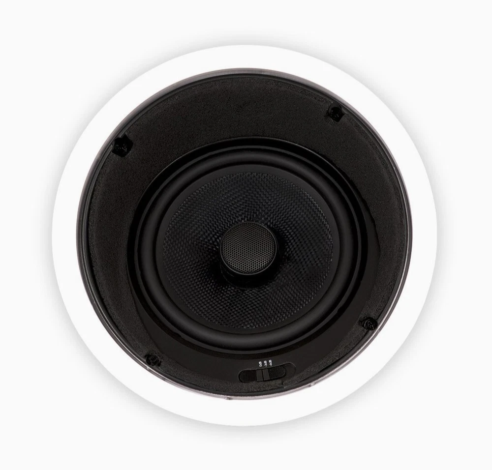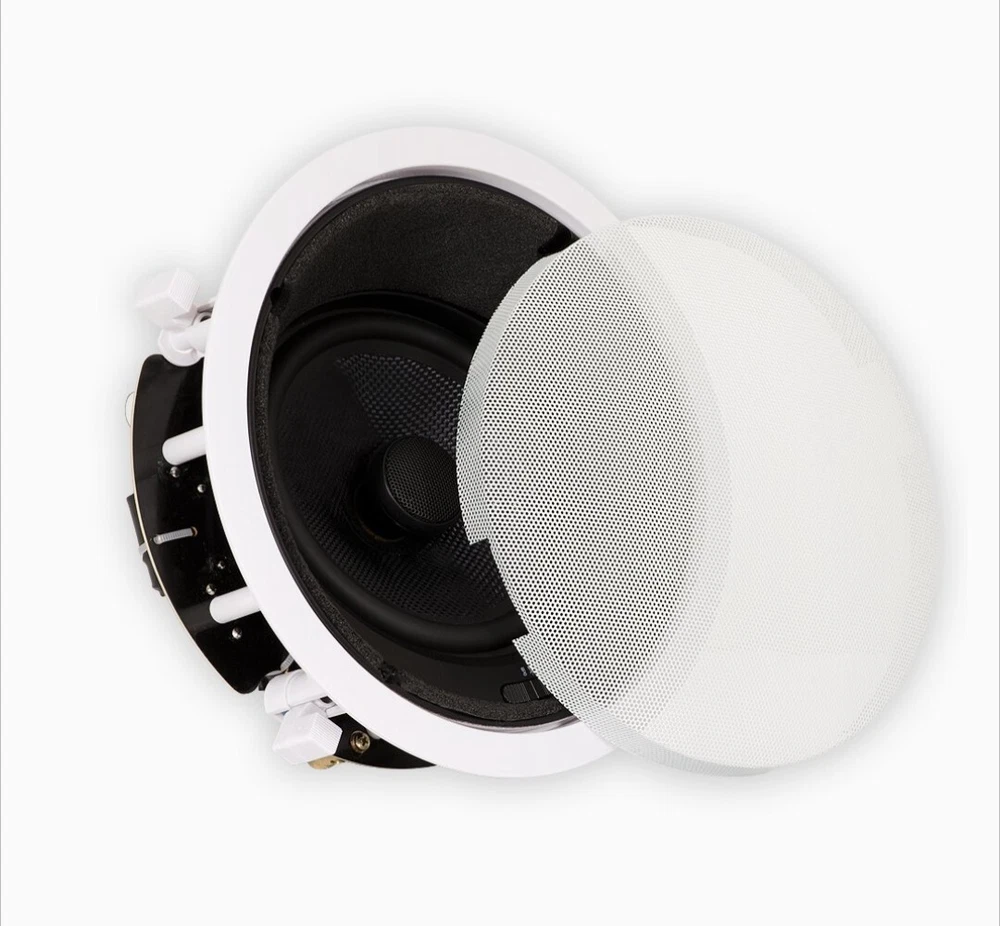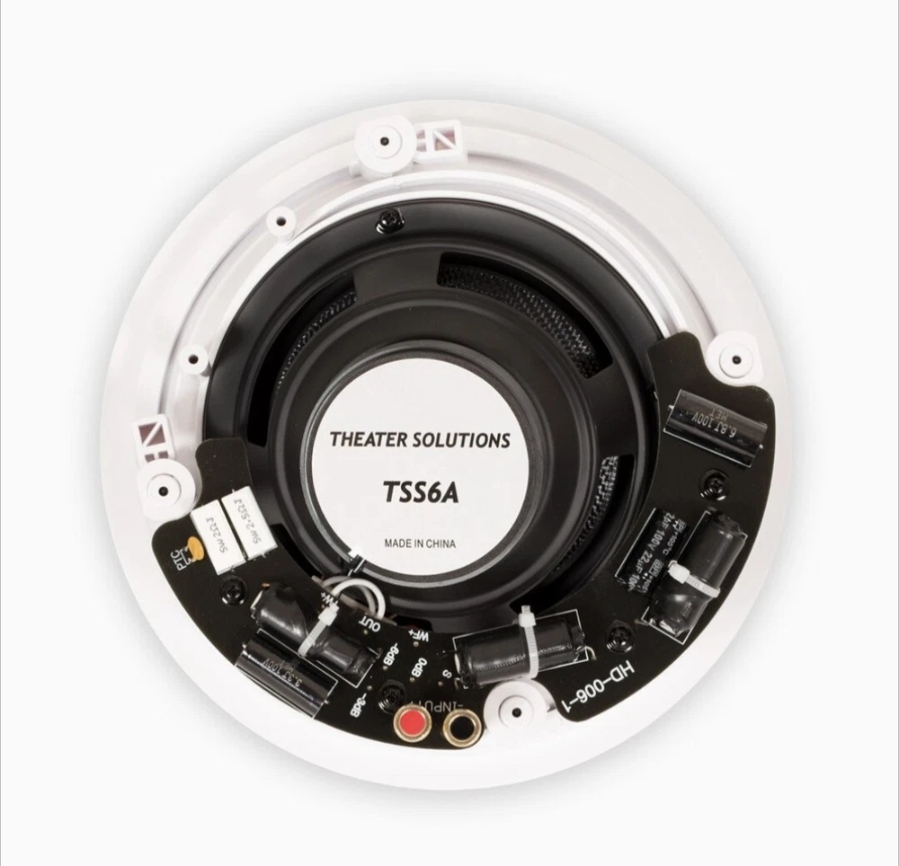 Theater Solutions symphony Series brand in-ceiling angled speaker is designed for consumers who demand the very best quality sound. The 15 degree angle is designed for directing the sound towards your listening area. This speaker is the perfect solution when in wall speakers are not an option. This speaker can be used as your front, rear or center channel. Deep bass, full bodied sound and comparable quality to the name brands, but at an affordable price. This speaker is perfect for home theaters, surround sound and all styles of music. Made with only the highest quality, moisture resistant materials to deliver unsurpassed sound in any listening environment. Sophisticated design and measurement equipment, including computer assisted design software were used to design this speaker to achieve an optimized balance and interface between components to give the very best quality performance and longer life. The easy in-ceiling installation and Ultra wide sound dispersion design make them ideal for discreet, single or multi-room installations. All of Theater Solutions speakers are self-mounting and feature the latest swing-out dog leg mounting system for easy installation. Paintable White aluminum Grills that offer added rust protection In moisture-prone areas such as bathrooms, kitchens and saunas; as well as a fabric scrim inside the grill that hides the drivers from view and will not interfere with the sound. The interlaced glass fiber 6. 5" Cone with butyl rubber surround is extremely lightweight yet rigid for even more extended bass, smooth high frequency response and greater power handling. The 1 inch pivoting liquid cooled silk dome tweeter offers the smoothest high frequency response and pivots to direct sound at listeners. The three position tweeter switch allows for precise tuning to your rooms acoustics. A 2nd order 18dB per octave Crossover round out the state of the art Components that add up to the best quality and design at a fantastic price! See less Features & details Theater Solutions TSS6A symphony Series angled in ceiling speaker, recommended power is 10-250 watts, efficiency is 95dB, frequency response is 28hz-21 kHz, 8ohm 2-Way design, 15 degree angle to direct sound to listeners, 6. 5" Extended Throw interlaced glass fiber cone woofer with butyl rubber surround, pivoting liquid cooled Silk dome tweeter 0dB, minus 3dB and minus 6dB tweeter adjustment switch, 2nd order 18dB per octave crossover, spring loaded wire terminals, paintable frame and grill, integrated wall-lock mounting system Cut out template and full instructions included, Cut out is 8. 625", overall is 9. 5", mounting depth is 5", designed and engineered in the USA