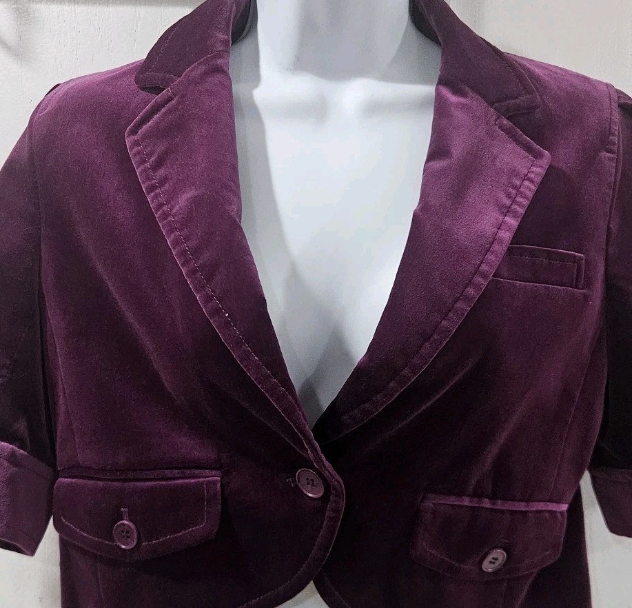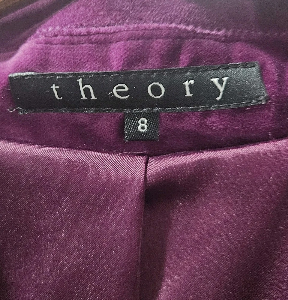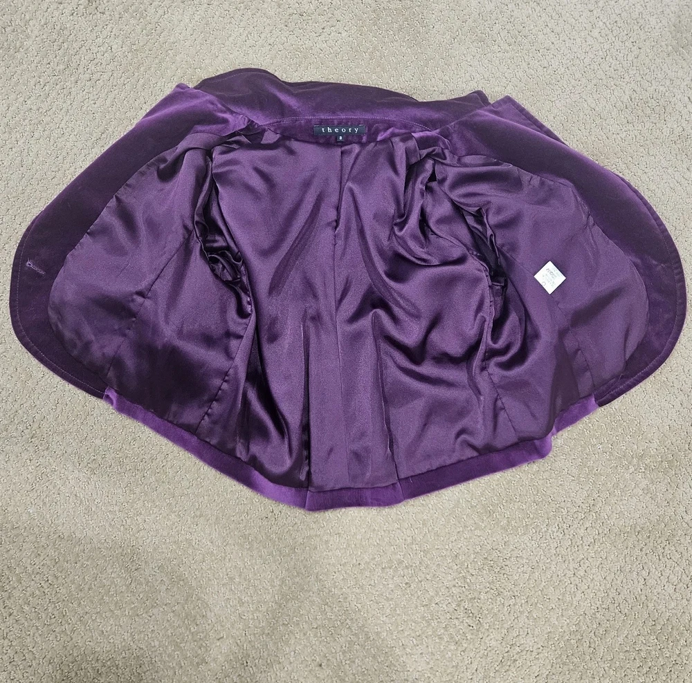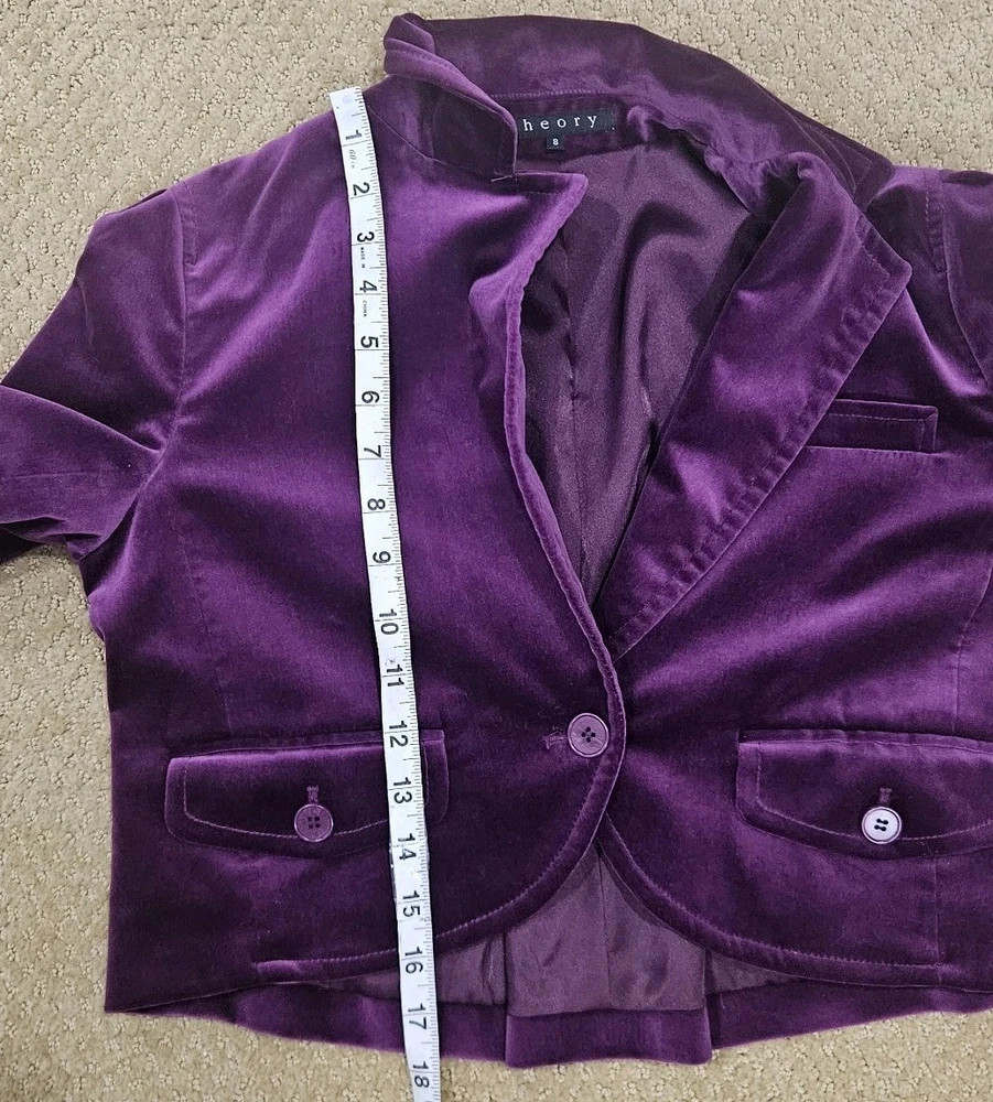 Theory Women's Cropped Blazer - Bolero, Witchy, Y2K Very good pre-owned condition, no flaws or signs of wear 98% cotton, 2% spandex Beautiful purple velvet jacket Jacket is cropped Marked a size 8 (may be slightly smaller than current sizing, see measurements) Approximate measurements 18 3/4 inches from armpit to armpit 17 3/4 inches in length from top of shoulder to bottom of hem in back 5 3/4 inches across sleeve opening AK-12