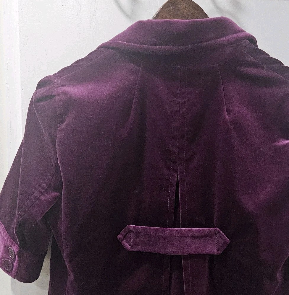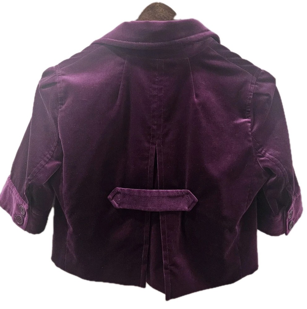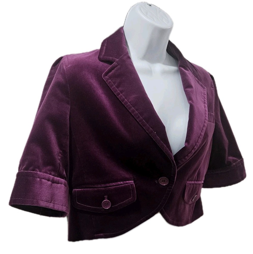 Theory Women's Cropped Blazer - Bolero, Witchy, Y2K Very good pre-owned condition, no flaws or signs of wear 98% cotton, 2% spandex Beautiful purple velvet jacket Jacket is cropped Marked a size 8 (may be slightly smaller than current sizing, see measurements) Approximate measurements 18 3/4 inches from armpit to armpit 17 3/4 inches in length from top of shoulder to bottom of hem in back 5 3/4 inches across sleeve opening AK-12