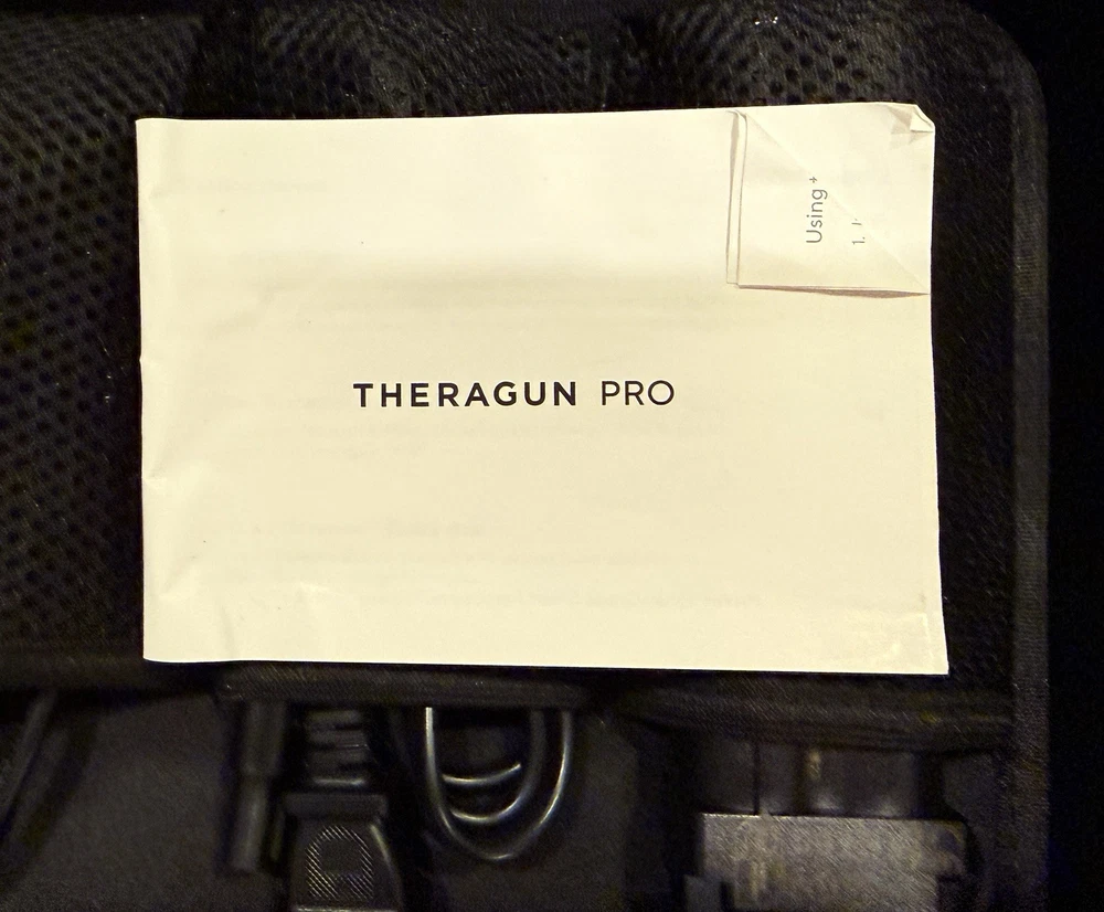 The percussive massager shown is a Theragun PRO (Product RED) Edition. This is a commercial-grade deep muscle treatment device featuring a signature triangular ergonomic handle and an adjustable arm. Theragun PRO (Product RED) Edition originally retailed for $599. Faster Recovery: Using it for just two minutes after exercise can provide the same recovery results as a 15-minute manual massage. Reduced Soreness: It helps prevent and reduce Delayed Onset Muscle Soreness (DOMS) by increasing circulation and helping to flush out metabolic waste like lactic acid. Improved Mobility: The rapid pulses help loosen tight fascia (connective tissue), which can increase your range of motion and flexibility. Pain Relief: The rhythmic tapping stimulates sensory receptors in the muscles that signal the brain to relax the area, effectively masking pain.