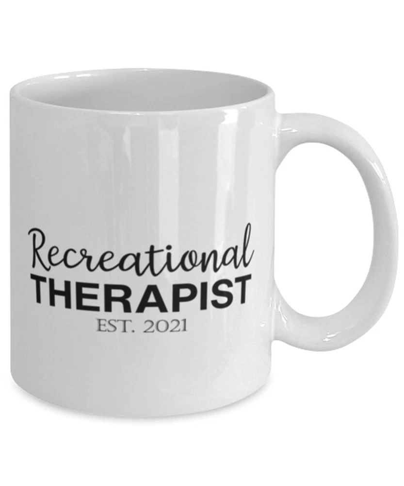 Therapist Graduation Mug Recreational Therapist Est 2021 Graduation Gift Gift Product Details.. This high quality 11oz. ceramic white mug has a premium hard coat that provides crisp and vibrant color reproduction sure to last for years. Perfect for all hot & cold beverages. The highest quality printing possible is used. It will never fade no matter how many times you wash it. Material: 100% Ceramic. Print both sides. Dishwasher and Microwave Safe. High Gloss + Premium White Finish. Printed in the U.S.A. Personalized & Custom. We support personalized and custom mug to add custom, when placing an order, you can add notes to the "order note" in shipping address section. Also you can contact us directly via message. Shipping Info. Ready to ship in 1 to 2 business days, All products are made-to-order and proudly printed in the United States. Shipped by USPS and DHL, You will receive your order in 5-7 days. Replace & Refund. All products are defective during shipping broken, chipped will be replaced free of charge. You are not satisfied with the product, we will refund 100% money to you. If any other issues arise, please do not hesitate to message, we would be more than happy to assist you.