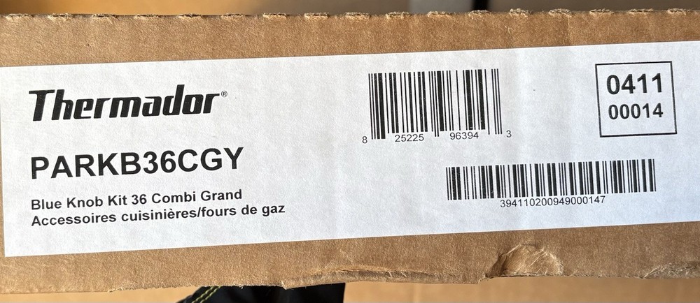 Thermador PARKB36CGY Blue Knob Kit. New and never used! In original and sealed box! For use with select Thermador Pro Grand Ranges Personalize your range with these blue knobs for a custom Thermador touch Comes with 10 knobs and 2 knob bases This item has a model number of PARKB36CGY