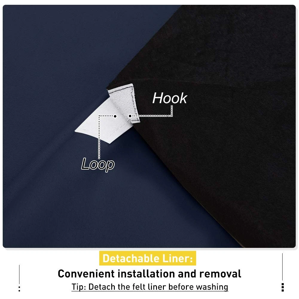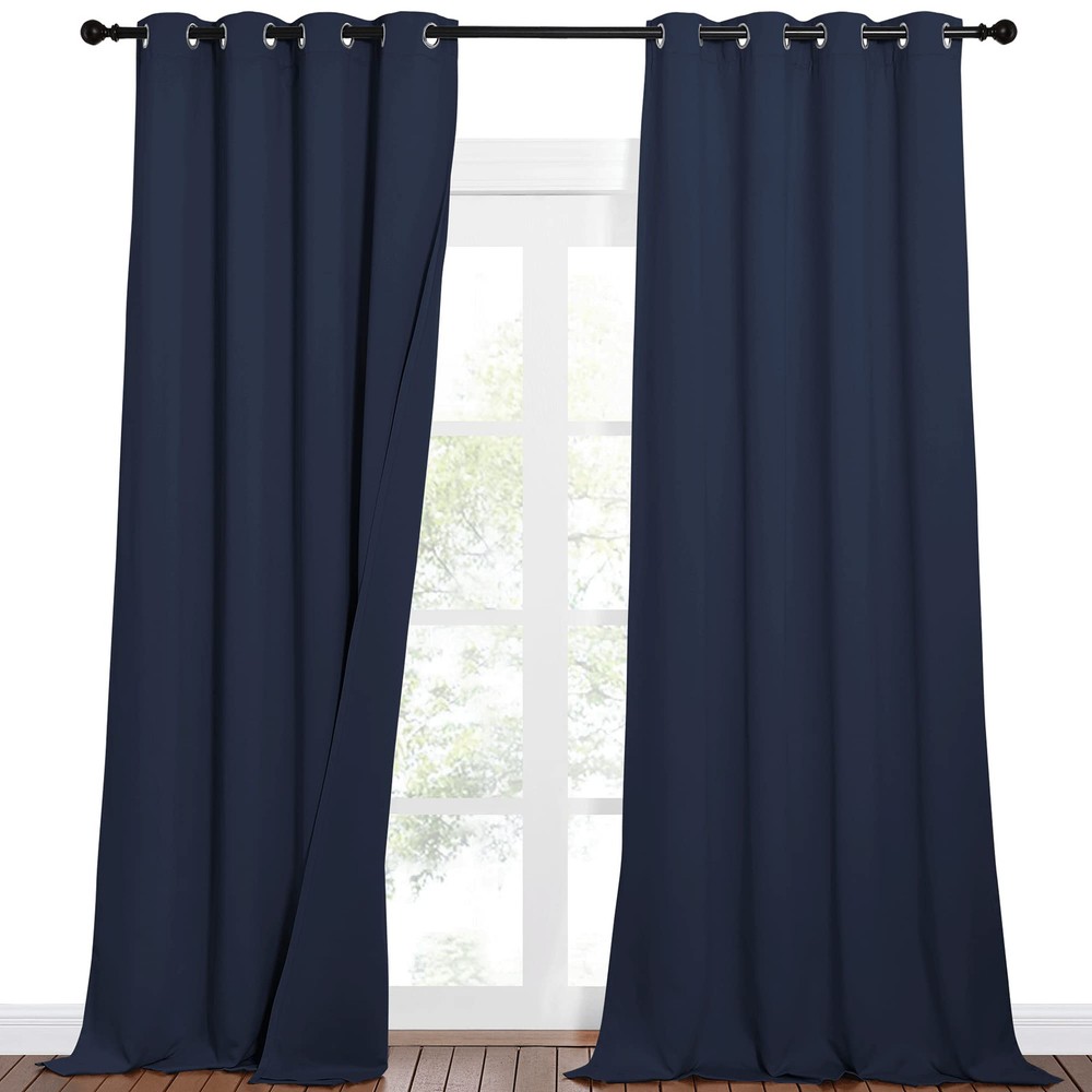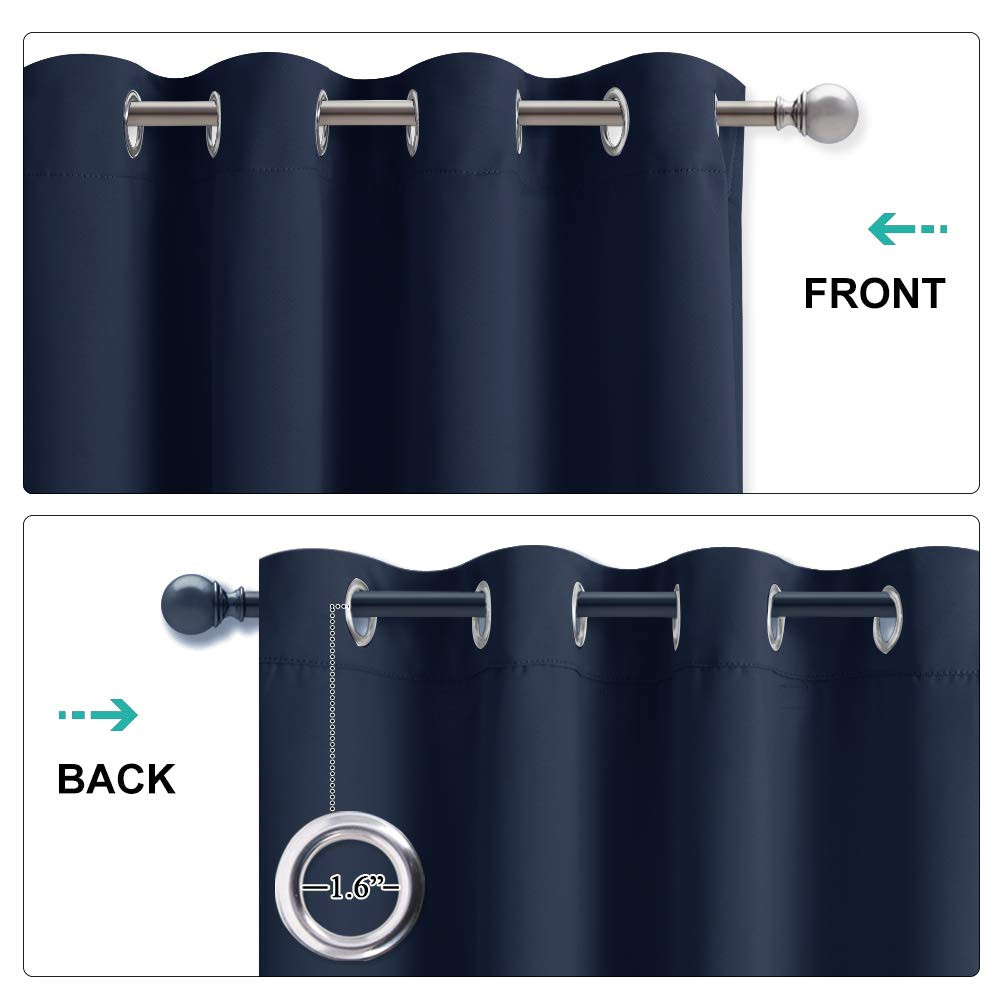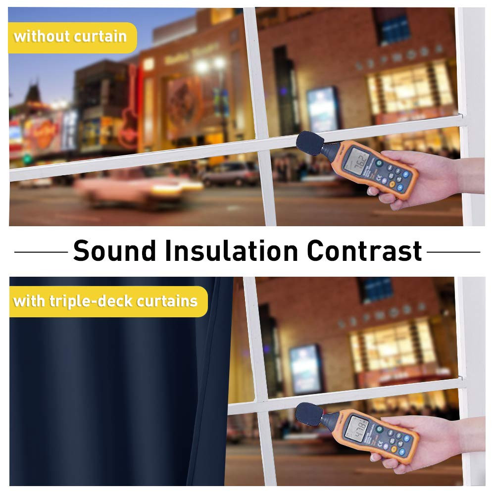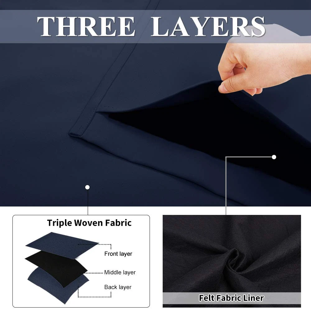 No matter where you live, California, Texas or even Florida, if you have the annoying sunshine of torture and street noise, and need a completely dark and quiet sleep environment, you can choose our 3-in-1 blackout curtains with noise absorbing liner. Different from other regular one layer blackout curtains, Thermal Insulated Blackout Lined Curtains go beyond that mundane function and provide the best benefits. FIT NICELY: Package includes 2 panels blackout curtains. 1.6" Grommet fits various standard or decorative curtain rod/pole. Due to grommet design, remember they narrow when you put them on a pole. Become shorter because of sewn into a 3-inch header with grommets. Particularly suitable: living room, kitchen, bedroom, baby room, villa, hall, and department, etc. MULTIFUNCTION: Draperies are thick enough to block out unwanted light completely and reduce some noise, encouraging day sleepers and the ones who have trouble falling asleep have a good sleep. The detachable felt fabric liner is in the middle of the 3 layers. Maximum absorb the annoying noise and create a peaceful environment. Not only that but also make your resting zone truly blissful. They would be perfect for any home theater and supply you with the enjoyment of watching TV in real darkness. The sophisticated designs allow you to brighten your home decor, making your living space more lively. Protect your furniture, floors, and artwork from the ravages of the sun. Lined Grommet Curtains have kept the room much warmer in winter and also block a lot of heat during summer, relieving the strain on home heating and cooling while reducing energy budget. READY MADE: 2 panels per package. Each Curtain with 1.6" diameter rings measures 52" wide x 90" long (Total width of 2 panels is 104"). 3 layers together: both sides as front and back are navy & 1 detachable felt fabric lining in the middle. NOISE REDUCING: Detachable felt fabric liner in the middle which makes the effect of absorbing sound is 2.5 times higher than the ordinary curtains. So that minimize the effect of noise on you at any time. But these curtains are not noise cancelling, but noise reducing. The more folds the better the noise dampening. 100% BLACKOUT: Curtains are made with 2 layers triple weave fabric and 1 layer detachable felt fabric liner. Thick enough to completely keep out the 100% SUNLIGHT and UV RAY. Offering you a real dark environment, a great choice for any room you would like to turn day into night. THERMAL INSULATION: 3-in-1 curtains can balance room temperature by insulating against summer HEAT and winter CHILL meanwhile protect PRIVACY. Help you to reduce energy costs. Tips: You will need a rod that is strong with a center support to support the heavy curtains. EASY CARE: Good quality finishing will withstand years of use. Detach the felt liner before machine wash. Machine washable and Wash the water temperature below 86℉. Mild detergent no bleaching. Low-temperature ironing.