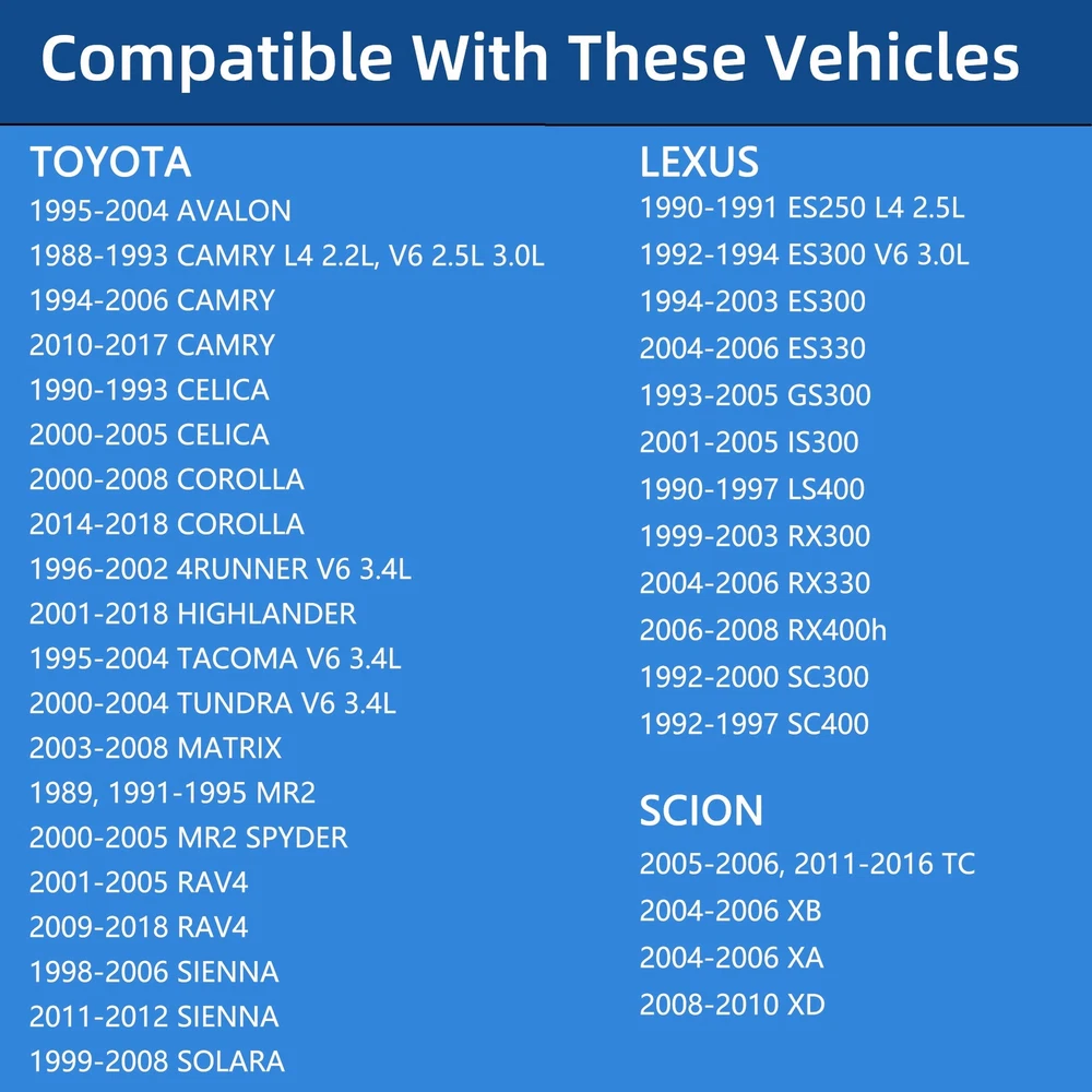 Important: Please Check The Year/Make/Model Carefully To Make Sure The Engine Thermostat Is What You Need Before Placing Order, Thanks! Thermostat Replaces Part Number :90916-A3003, 90916A3003, 90916-03129, 9091603129 ( Includ 1988 1989 1990 1991 1992 1993 1994 1995 1996 1997 1998 1999 2000 2001 2002 2003 2004 2005 2006 2007 2008 2009 2010 2011 2012 2013 2014 2015 2016 2017 2018 2019 Year Models) Compatible With Toyota: 1995-2004 Avalon 1988-1993 Camry L4 2.2L, V6 2.5L 3.0L 1994-2006 Camry 2010-2017 Camry 1990-1993 Celica 2000-2005 Celica 2000-2008 Corolla 2014-2018 Corolla 1996-2002 4Runner V6 3.4L 2001-2018 Highlander 1995-2004 Tacoma V6 3.4L 2000-2004 Tundra V6 3.4L 2003-2008 Matrix 1989, 1991-1995 MR2 2000-2005 MR2 Spyder 2001-2005 RAV4 2009-2018 RAV4 1998-2006 Sienna 2011-2012 Sienna 1999-2008 Solara 2009-2015 Venza 1995-1998 T100 V6 3.4L Compatible With Lexus: 1990-1991 ES250 L4 2.5L 1992-1994 ES300 V6 3.0L 1994-2003 ES300 2004-2006 ES330 1993-2005 GS300 2001-2005 IS300 1990-1997 LS400 1999-2003 RX300 2004-2006 RX330 2006-2008 RX400h 1992-2000 SC300 1992-1997 SC400 Compatible With Scion: 2005-2006, 2011-2016 tC 2004-2006 xB 2004-2006 xA 2008-2010 xD Package Include:1 x Engine Thermostat. 【THERMOSTAT REPLACEMENT】90916-A3003, 90916A3003, 90916-03129, 9091603129 Engine Thermostat For Toyota Is 100% Rigorously Tested Before Shipping. Check The Part Number To Confirm The Compatibility Before Purchase. High Quality Materials, Engine Thermostat Is Constructed Of Premium Material For Long Lasting Durability And Reliability. Direct Replacement, Easy Installation. 【COMPATIBLE WITH TOYOTA VEHICLES】Thermostat Compatible With 1988-1993 Camry L4 2.2L, V6 2.5L 3.0L | 1994-2006,2010-2017 Camry | 1995-2004 Avalon | 1990-1993,2000-2005 Celica | 2000-2008,2014-2018 Corolla | 1996-2002 4Runner V6 3.4L | 2001-2018 Highlander | 1995-2004 Tacoma V6 3.4L | 2000-2004 Tundra V6 3.4L | 2003-2008 Matrix | 1989, 1991-1995 MR2 | 2000-2005 MR2 Spyder | 2001-2005,2009-2018 RAV4 | 1998-2006,2011-2012 Sienna | 1999-2008 Solara | 2009-2015 Venza |1995-1998 T100 Thermostat. 【COMPATIBLE WITH LEXUS VEHICLES】Thermostat Compatible With 1990-1991 ES250 L4 2.5L | 1992-1994 ES300 V6 3.0L | 1994-2003 ES300 | 2004-2006 ES330 | 1993-2005 GS300 | 2001-2005 IS300 | 1990-1997 LS400 | 1999-2003 RX300 | 2004-2006 RX330 | 2006-2008 RX400h | 1992-2000 SC300 | 1992-1997 SC400 Thermostat. 【COMPATIBLE WITH SCION VEHICLES】Thermostat Compatible With 2005-2006, 2011-2016 Scion tC | 2004-2006 Scion xB | 2004-2006 Scion xA | 2008-2010 Scion xD Thermostat. 【Replace Vehicles Year】Can Fit Vehicles Included Year 1988 1989 1990 1991 1992 1993 1994 1995 1996 1997 1998 1999 2000 2001 2002 2003 2004 2005 2006 2007 2008 2009 2010 2011 2012 2013 2014 2015 2016 2017 2018 2019, Please Check The Year/Make/Model Carefully