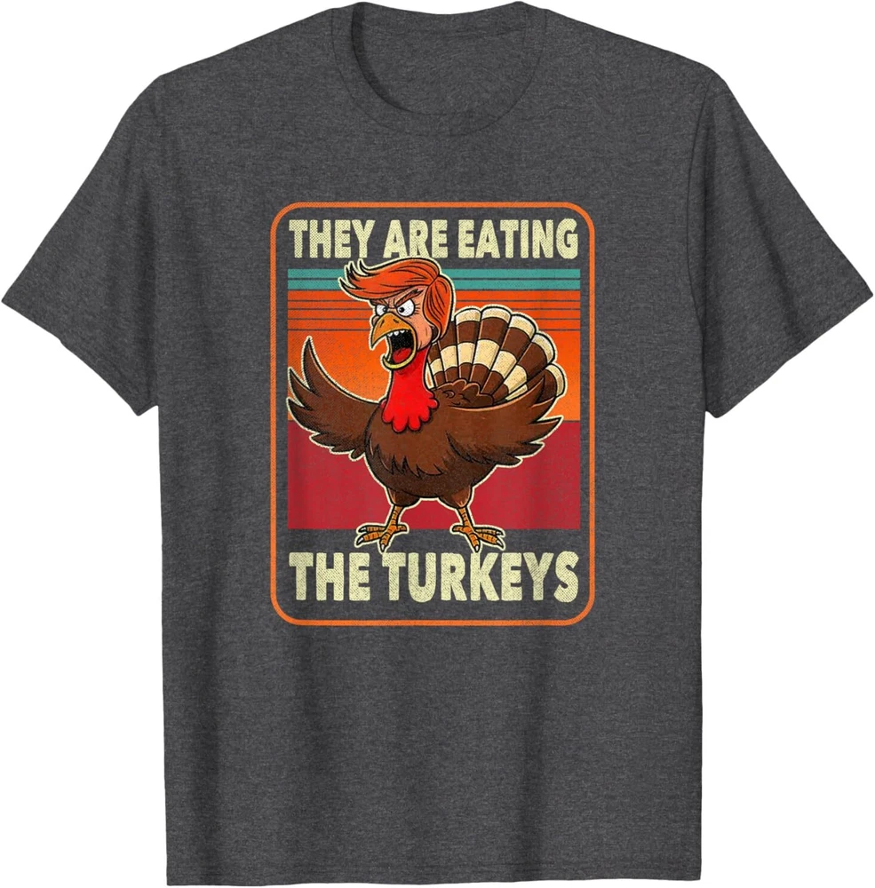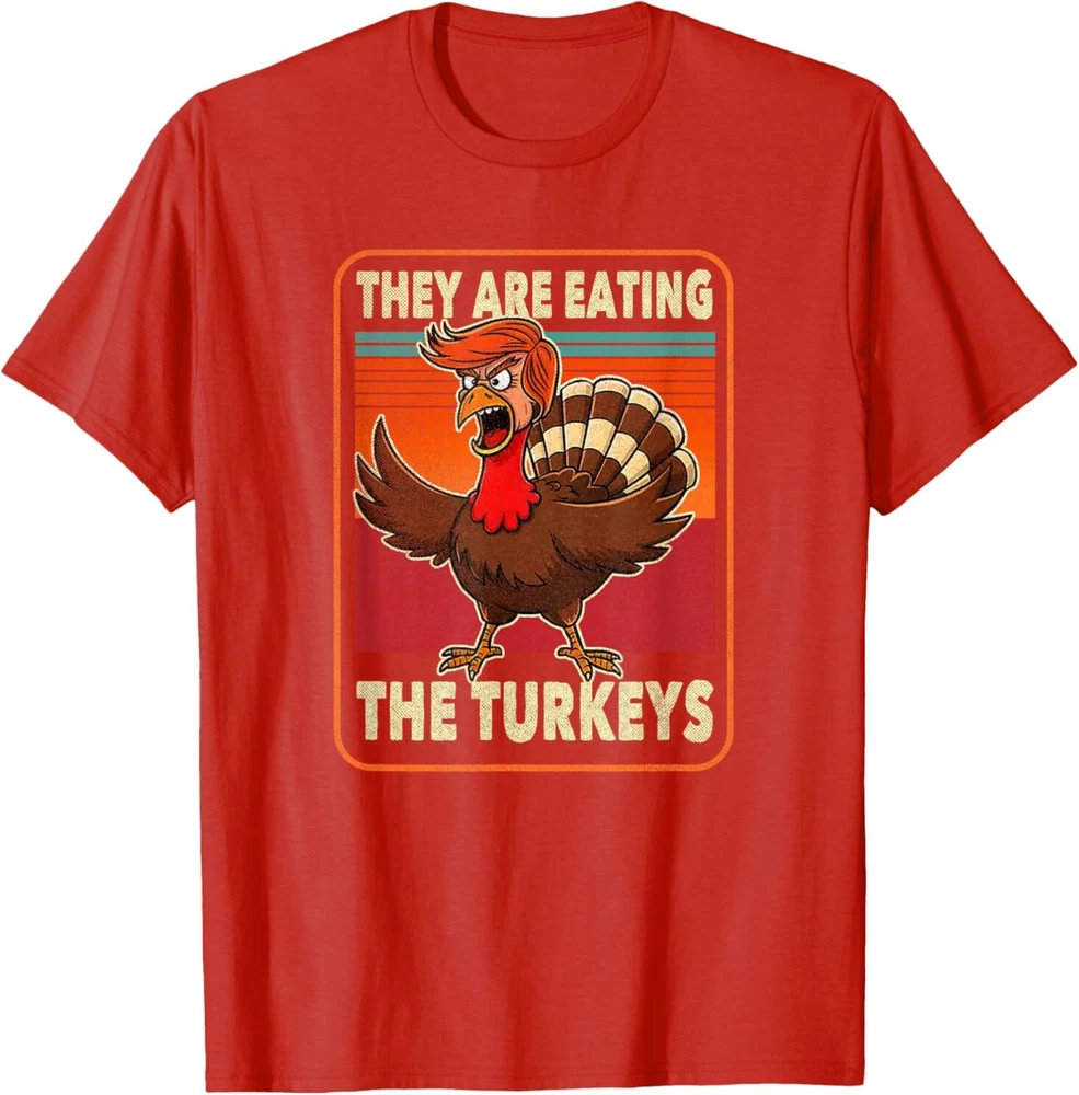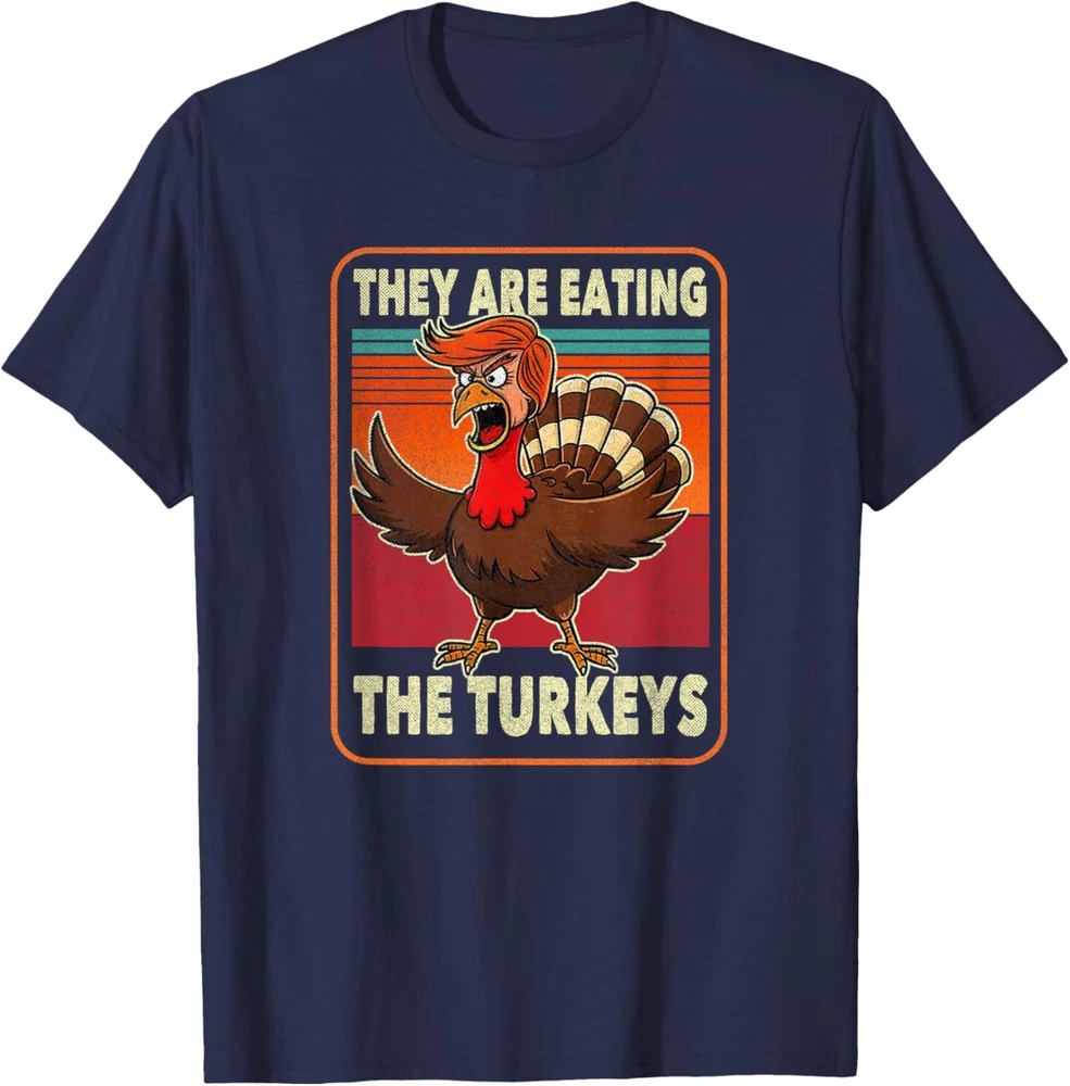 They Are Eating The Turkeys Tnaksgiving Trump Humor Kamala T-Shirt Designed and Printed in USA Product Features: • Classic Look and Feel: This ultra cotton tee offer the timeless appeal of traditional cotton. The high-quality print enhances its casual appearance. • Material: Made from 6.1-ounce, 100% cotton. (Note: Dark Heather variant is 50% cotton, 50% polyester.) • Durability: Features double-needle stitching on the neck, sleeves, and hem for added durability. Designed for a roomy, unisex fit. • Print Type: DTG (Direct to Garment) • Manufacturer: Gildan 5000, 5000b (Made in USA) Shipping Information: • Handling Time: With POD(Print-On-Demand) product model, we typically require about 3 business-days handling time before shipping. In most cases, our handling time’s , rang e from 1-2 business days. • Delivery Time: • USA: Approximately 2 -6 business days • Canada: Approximately 6-10 business days (We currently don’t offer international Shipping) • Worldwide: Approximately 15-25 business days (We Currently don’t offer international Shipping) • Shipping Carriers: USPS and DHL • Note: Business days exclude weekends and holidays. Return & Exchange Policy: • Quality Guarantee: We stand behind the quality of our products and workmanship . Any defects or errors on our part must result in a refund/ replacement at no charge. • Conditions for Returns: Returns are generally not accepted for user errors such as incorrect selection of sizes, designs, or colors. Returns /Replacements are acceptable for damages such as poor printing results, incorrect size or design caused by us. • Note: Please reach out to us if there are any questions or issue s with your item, we’ll do our best to resolve any issue you might have. Note: • We’re glad to have your support! If you have a moment, y our honest feedback is very valuable to us. Thank you!