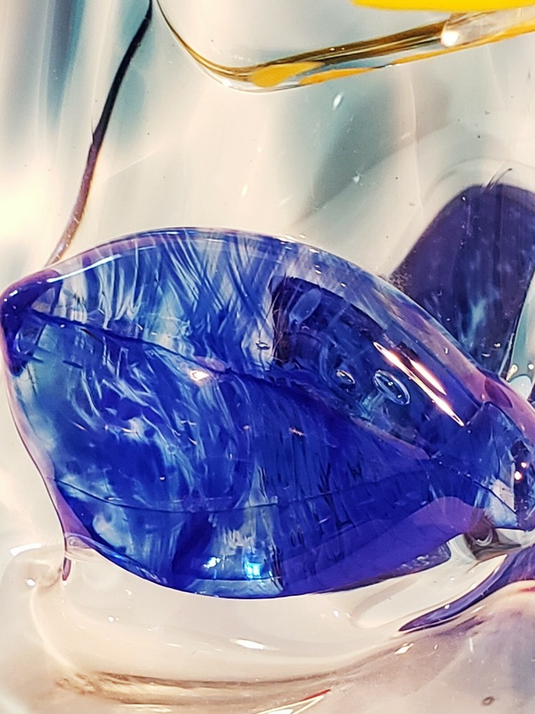 Art Glass Heavy Thick Vase Funky Yellow Blue wrapped . Wild looking yellow wrapped stretched top 8" x 5" half inch thick very funky cool look . Very tiny flea bite on the top upper edge besides that very good condition no chips or cracks just a great design.