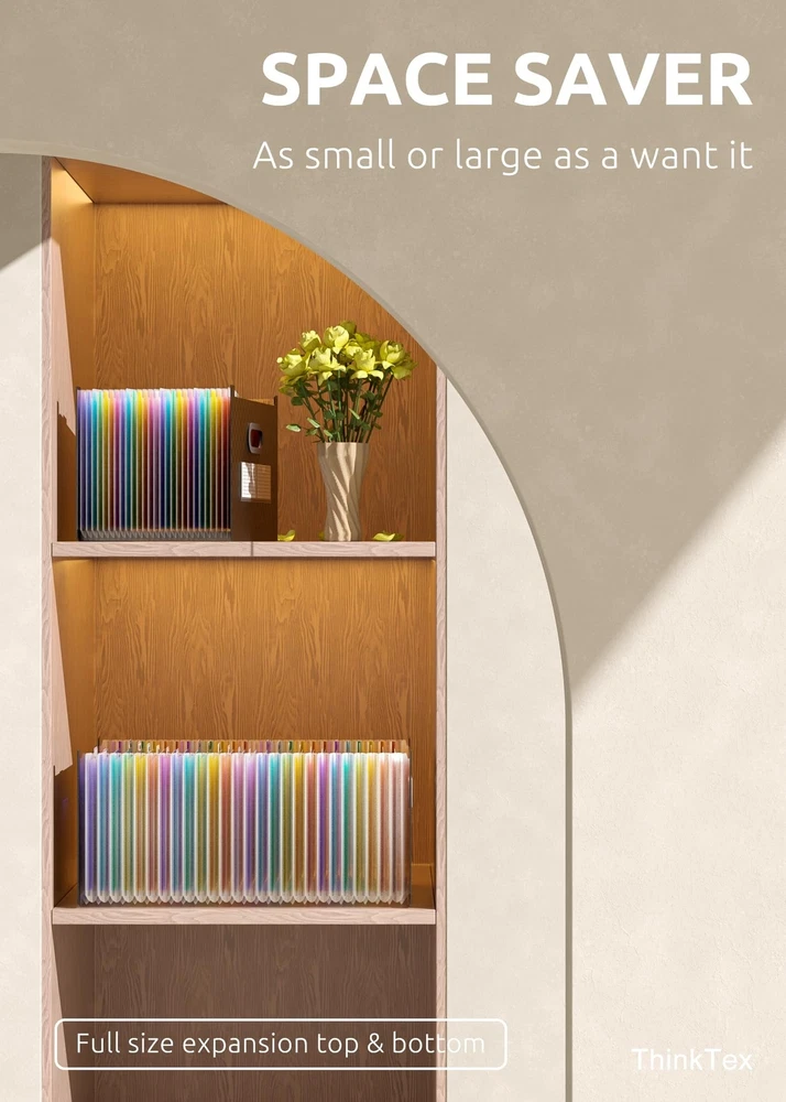 ThinkTex 26 Pockets Expanding File Folder, Upright & Open Top, A-Z Colorful Tabs, Larger Capacity Accordian Folder, Letter/A4 Size for School, Home and Office Product Details Size: 26 Pockets Color: Matt Brand: ThinkTex MPN: 2021 new version UPC: 747966040779 EAN: 0747966040779 Color: Matt Material: Polypropylene (PP) Style: 26 Pockets Brand: ThinkTex Sheet Size: Letter, A4 Manufacturer: ThinkTex Brand: ThinkTex Item Weight: 1.19 pounds Product Dimensions: 13 x 9.4 x 28 inches Item model number: 2021 new version Color: Matt Material Type: Polypropylene (PP) Tab Cut: 1/5 Cut Tab Position: Top Size: 26 Pockets Sheet Size: Letter, A4 Manufacturer Part Number: 2021 new version Date First Available: June 10, 2021 UPRIGHT & EXPANDABLE - ThinkTex Accordion File Organizer, 26 pockets, A-Z multi-colored tabs, Open top, for letter/A4 size LARGE CAPACITY & SPACE SAVER - 26 pockets, full size expansion top & bottom, expand and shrink with growing files flexibly, as small or large as a want it EASY ACCESS - No cover and no hamper, open top and A-Z colorful Tabs, coding files in alphabetical order FREE-STANDING - Polypropylene (PP) material, more thicker, sturdy and durable. Perfectly standing in your drawer, closet or cabinet Tips: To keep the file organizer balanced and standing, Please don't store bulky files on just one side. (Not suit to move filled folder from place to place frequently)