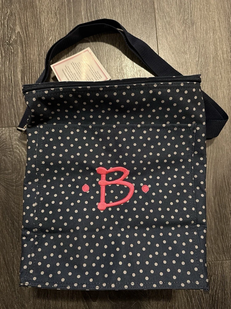 This Thirty-One Lunch tote bag is perfect for a day at the beach or a picnic in the park. The bag is designed with a blue exterior color and features an etched shells letter "B" design. It has a zip closure and measures 12 inches in width, 13 inches in height, and 7 inches in depth. The bag is made of polyester and has a nylon handle/strap material in blue color. The tote bag is insulated and has a gray lining color. The product line is Thirty-One Lunch and it is a medium-sized bag.
