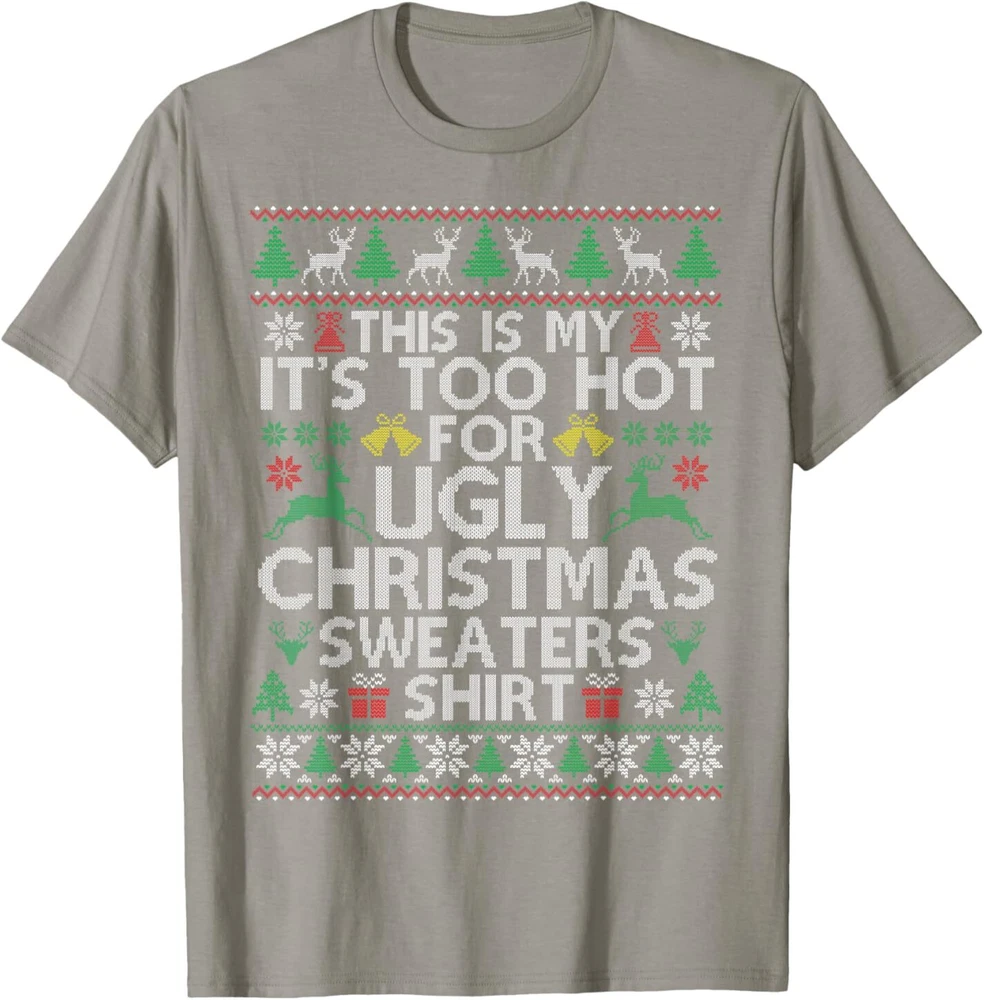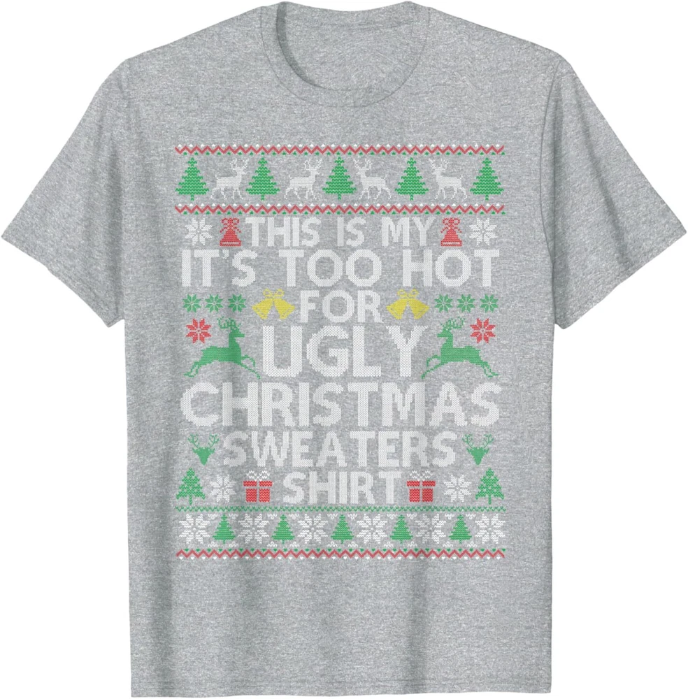 This Is My It's Too Hot For Ugly Christmas Sweaters T-Shirt Designed and Printed in USA Product Features: • Classic Look and Feel: This ultra cotton tee offer the timeless appeal of traditional cotton. The high-quality print enhances its casual appearance. • Material: Made from 6.1-ounce, 100% cotton. (Note: Dark Heather variant is 50% cotton, 50% polyester.) • Durability: Features double-needle stitching on the neck, sleeves, and hem for added durability. Designed for a roomy, unisex fit. • Print Type: DTG (Direct to Garment) • Manufacturer: Gildan 5000, 5000b (Made in USA) Shipping Information: • Handling Time: With POD(Print-On-Demand) product model, we typically require about 3 business-days handling time before shipping. In most cases, our handling time’s , rang e from 1-2 business days. • Delivery Time: • USA: Approximately 2 -6 business days • Canada: Approximately 6-10 business days (We currently don’t offer international Shipping) • Worldwide: Approximately 15-25 business days (We Currently don’t offer international Shipping) • Shipping Carriers: USPS and DHL • Note: Business days exclude weekends and holidays. Return & Exchange Policy: • Quality Guarantee: We stand behind the quality of our products and workmanship . Any defects or errors on our part must result in a refund/ replacement at no charge. • Conditions for Returns: Returns are generally not accepted for user errors such as incorrect selection of sizes, designs, or colors. Returns /Replacements are acceptable for damages such as poor printing results, incorrect size or design caused by us. • Note: Please reach out to us if there are any questions or issue s with your item, we’ll do our best to resolve any issue you might have. Note: • We’re glad to have your support! If you have a moment, y our honest feedback is very valuable to us. Thank you!