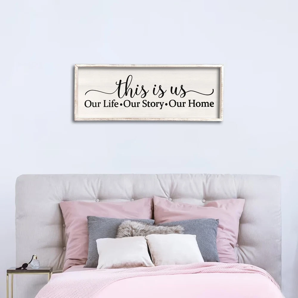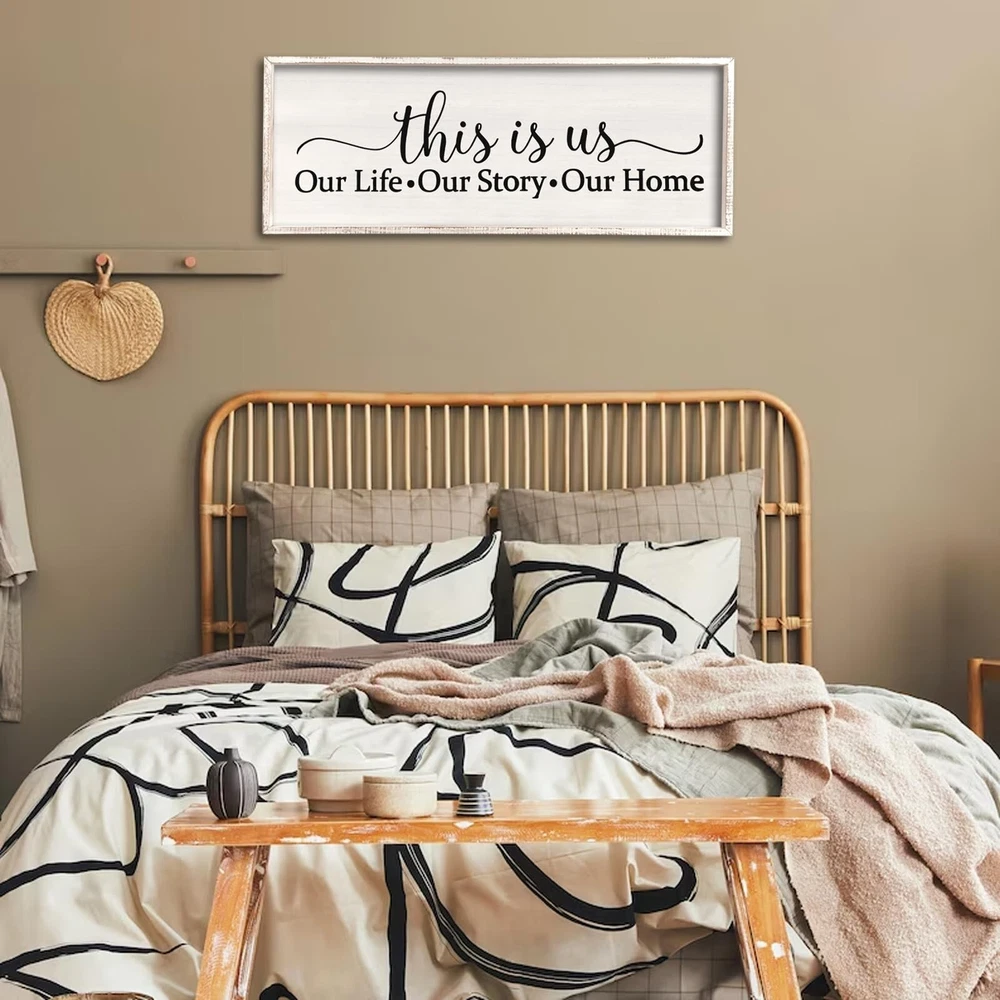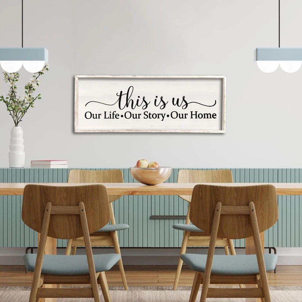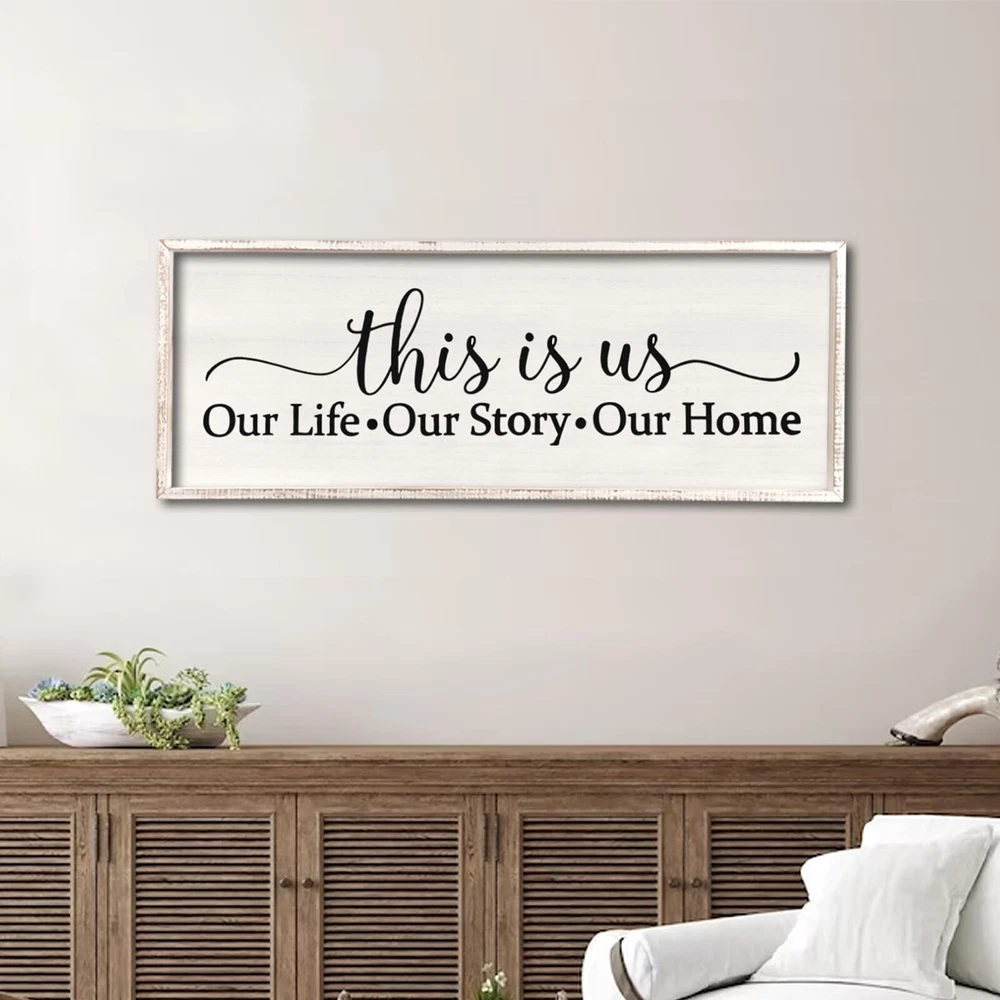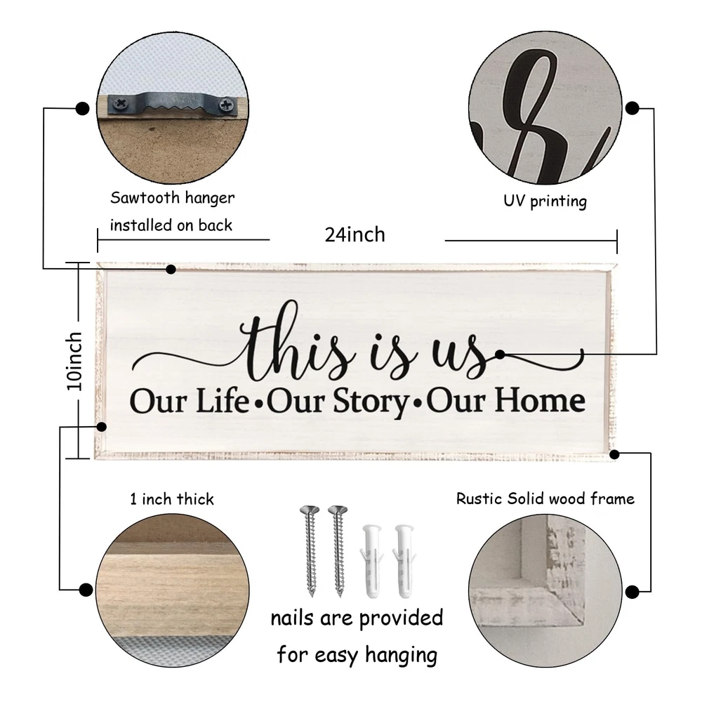 This Is Us Sign Wall Decor for Bedroom 24''×10'' Large Vintage Framed Wooden Modern Farmhouse Room Rustic Family Sign Wall Art Hanging Home Decor (White) Product Details Size: 24L" x 10W" Color: White Brand: Surfapans MPN: CK-QIANGGUA-20230727 UPC: Does not apply EAN: Does not apply Product Dimensions: 24 x 10 x 0.2 inches Item Weight: 1.45 pounds Manufacturer: Surfapans Country of Origin: China Item model number: CK-QIANGGUA-20230727 Date First Available: November 14, 2023 Quality Material: The frame made of premium-grade solid wood, middle part is made of a solid thick fiberboard, size is 24''10'' 1''. Easy to Hang: wall decor Saw-tooth hangers are installed on the back, and are equipped with screws for easy hanging. Exquisite Craftsmanship: The frame is hand-stained, Every piece is one-of-a-kind, The central section utilizes UV printing which is colorful and no fading, and can be cleaned with a damp cloth and it will not ruin the print. Unique Gift: It is the best choice for Valentine's Day, thanksgiving, christmas, Mother's Day, Father's Day, Housewarming, wedding, birthday, these are a fun and sweet way to show your love. Multi Use Scenes: It is a good idea for decorating your bedroom, living room, teen girl bedroom, hallway, dorm room, and it is also able to stand on table, shelf and everywhere.