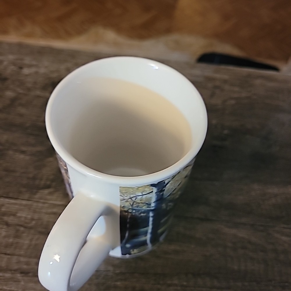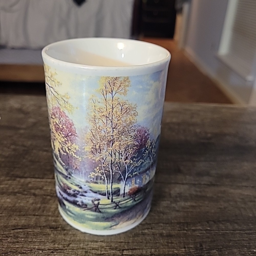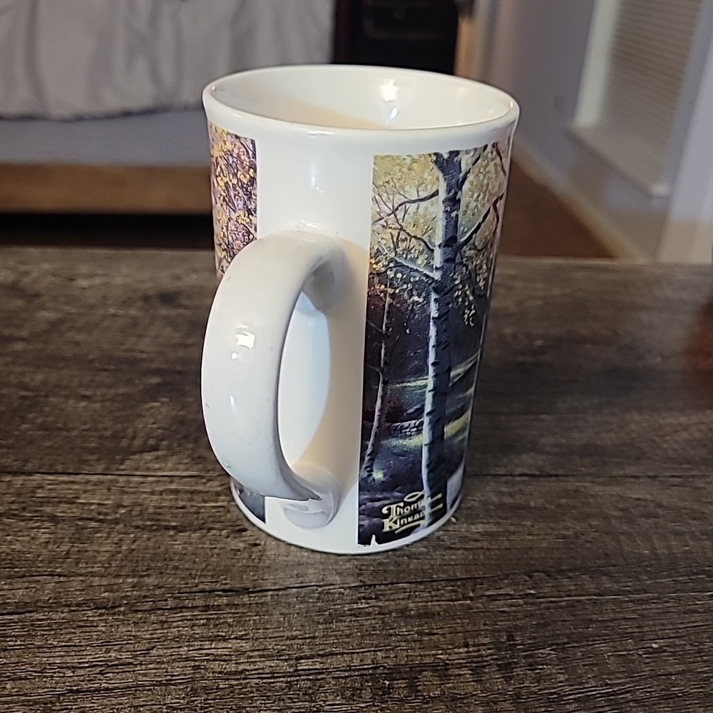The Thomas Kincade "The Aspen Chapel" 2001 Tall 12oz Coffee Mug Cup by DesignPac Inc. is a beautifully crafted white coffee cup featuring a stunning design of a chapel in aspen trees. This tall mug is perfect for enjoying your favorite hot beverages while adding a touch of elegance to your kitchen or dining area. Made by a reputable brand, this coffee mug is both functional and visually appealing, making it a great addition to your collection of dinnerware.
