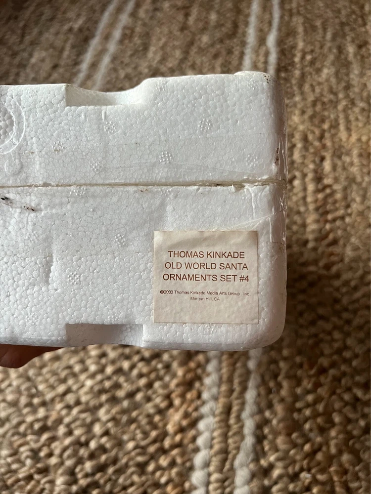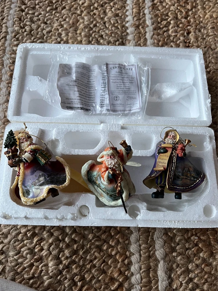 Set of three Thomas Kinkade Old World Santa Christmas ornaments from Ashton Drake. From set #4. Includes COA and original packing.