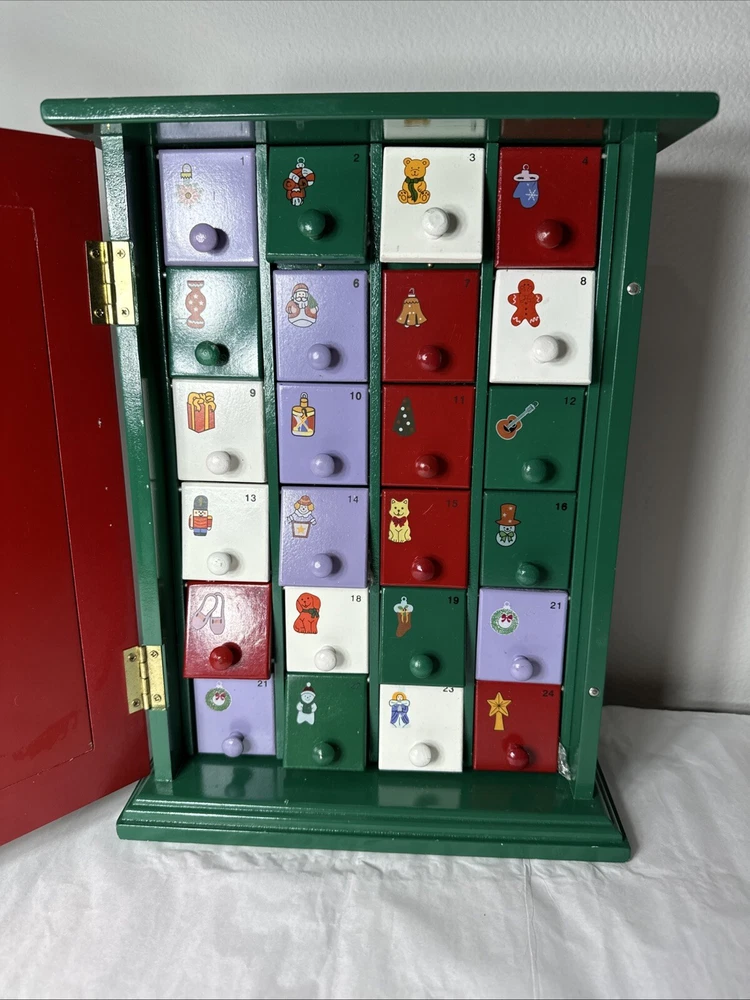 Get ready for the holiday season with this beautiful Thomas Pacconi Classics Christmas Countdown Box Advent Calendar. Made of high-quality wood, this rectangular-shaped calendar features a festive multicolor design that is perfect for any Christmas occasion. The calendar was manufactured in 2004 and comes with ornaments, making it a great addition to your home decor . All 24 advent calendar surprises NEW and hidden behind each door!