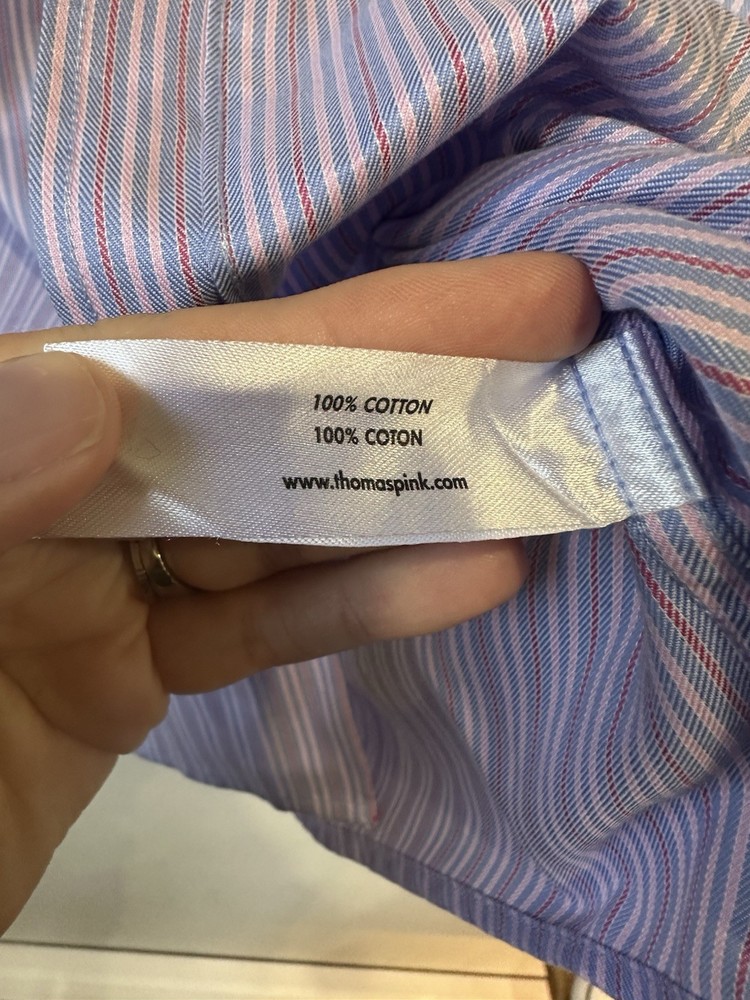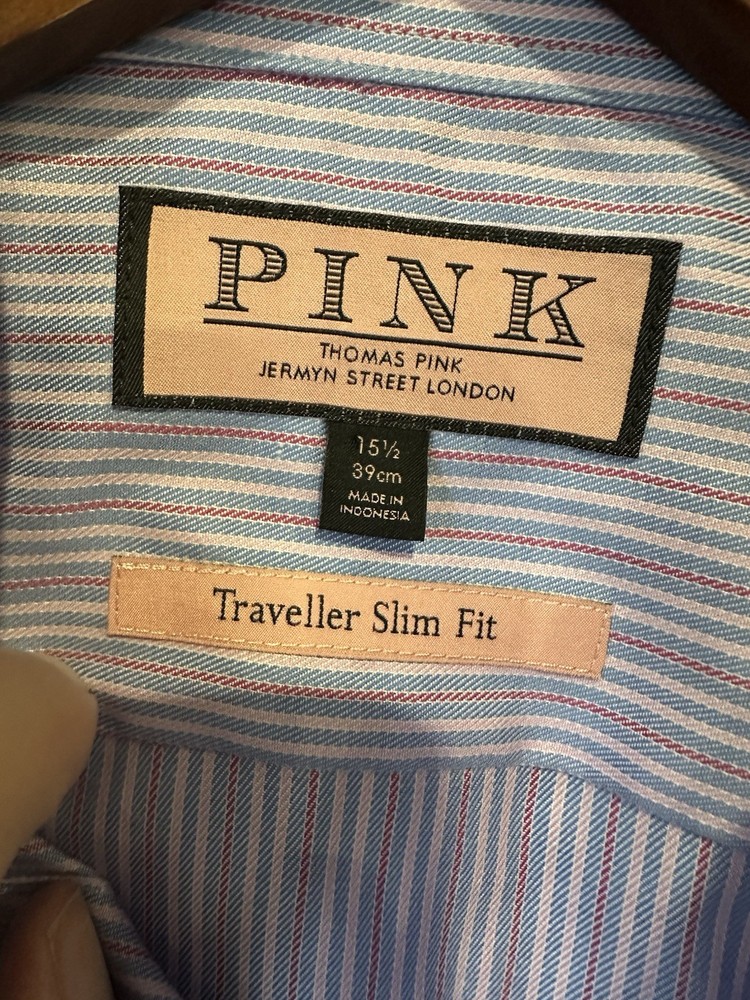 The Thomas Pink Button Up dress shirt in blue and pink stripes is made from 100% cotton, making it a breathable and versatile option for all seasons. This slim fit shirt features a button-down collar, long sleeves, and a woven fabric type with a medium wash. Perfect for formal, business, or travel occasions, this shirt embodies a classic London style with a colorful twist. The Teveller Slim Fit model from Thomas Pink is a high-quality option for men looking for a stylish and comfortable addition to their wardrobe.