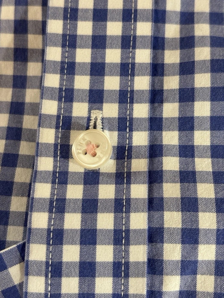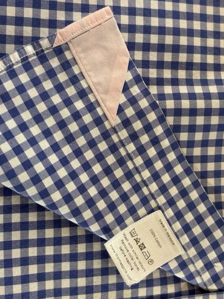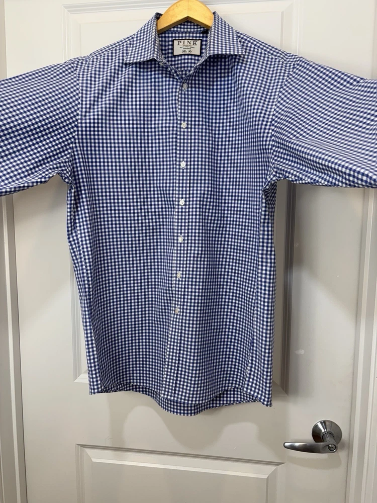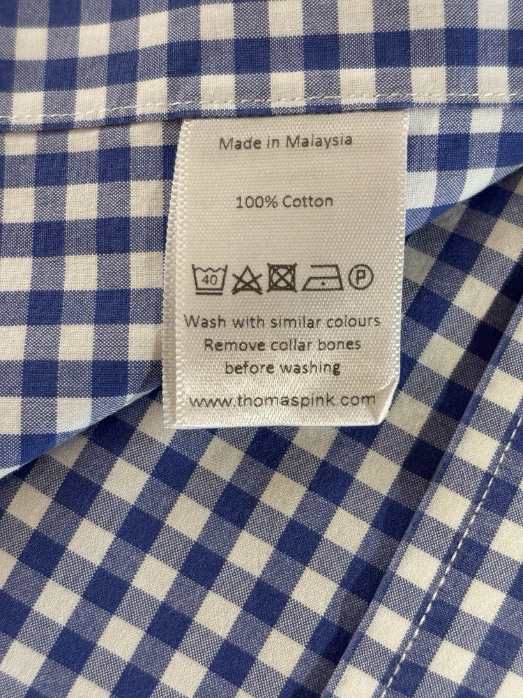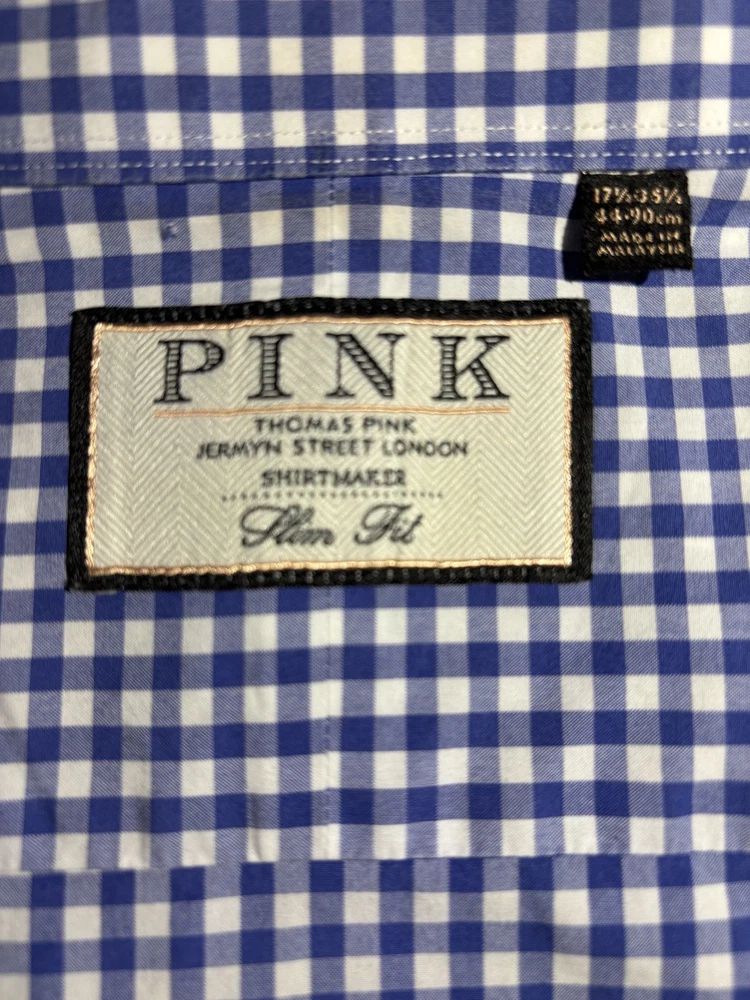 The Thomas Pink Jermyn Street London 17.5-35.5 Slim Fit Traveller Dress Shirt in Blue Check is a stylish and sophisticated choice for any formal occasion. Made from 100% cotton with a woven fabric type, this shirt features a collared neckline and long sleeves with a button closure. The slim fit and spread collar style add a modern touch to the classic design, making it a perfect option for weddings, parties, workwear, or business events. The blue check pattern and designer brand Thomas Pink bring a touch of London charm to this timeless and colorful dress shirt. C-22