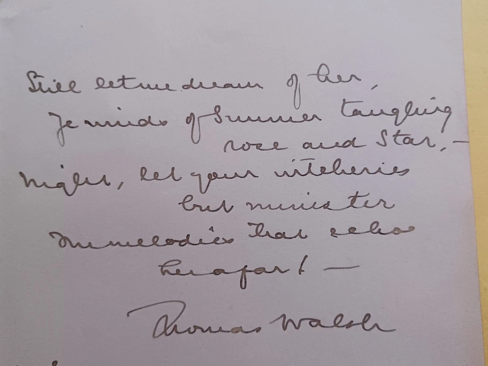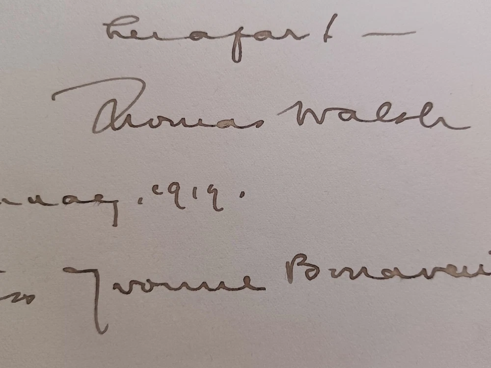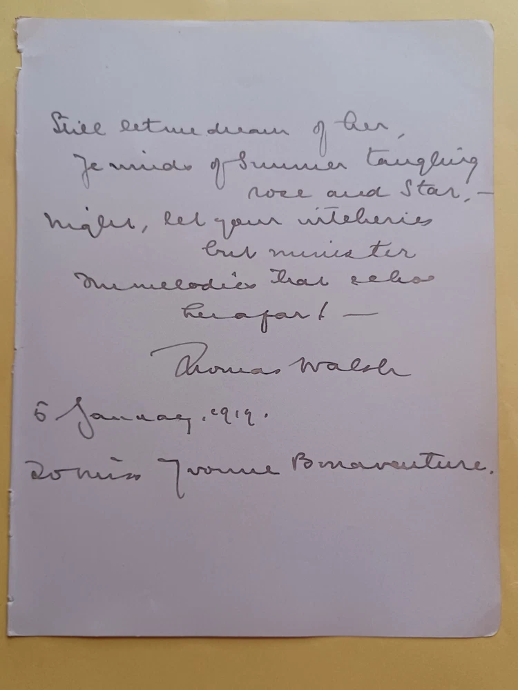 Hi everybody. This is a 7.25" x 9.25" album page signed by Thomas Walsh. The page is dated January 6, 1919 and is addressed to Miss Yvonne Bonaventure. This comes from an autograph album that originally belonged to a woman named Yvonne Bonaventure. Bonaventure's father, Edmond Francis Bonaventure, was an art and book dealer. The original autograph album included numerous signatures from notable people in the early 1900s. If you do a search for "Autograph Book With American And European Luminaries Of World War I And 1920s," you'll find the auction listing for the entire album that was sold by University Archives in 2023. The listing states that the album came with authentications from PSA, JSA, noted authenticator John Reznikoff, and several auction houses. Unfortunately, I do not have copies of any of those authentications. Please see photo for condition. Shipping and handling is $4.99. Additional autographs and other flat items ship for free. I combine shipping on multiple items won when possible. Feel free to email me with any questions. Thanks for looking and have a great day!