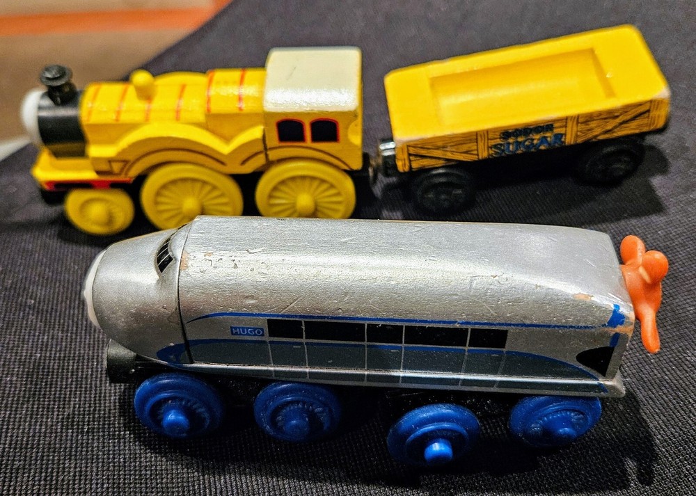 Thomas Wooden Railway Train: Hugo the Zeppelin Blimp Engine, Molly, and Sugar Barrel Car Used with some signs of minor wear here and there. Please see pictures. Free shipping in the U.S.