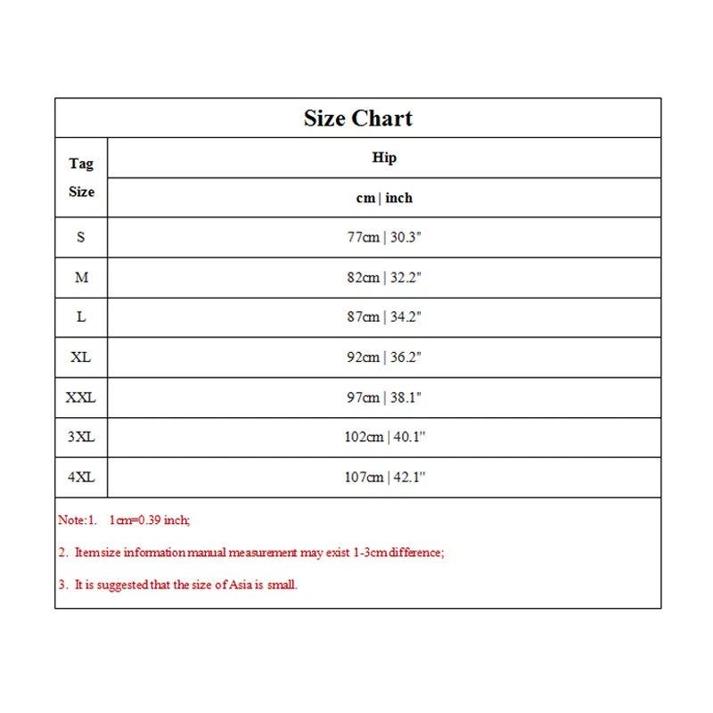 Welcome to Our Store! We Are Offering High Quality Products with Reasonable Wholesale Price. All Products Are Supply from Factory Directly. Excellent Service and Fast Shipping. Description Specifications: *100% Brand new and high quality. Description: Size:S,M,L,XL,XXL,3XL,4XL Color: black,rose red Waist Type: Low Pattern:solid color Garment:Hand washing or machine washing,line dry. Note: 1.Due to the light and screen difference, the item's color may be slightly different from the pictures. Please understand. 2.Please allow 2-3% error due to manual measurement.Please make sure you don’t mind before you mid. 3.Size doesn’t fit all.Please carefully check size chart and select the size Package:1 pcs panty Size Chart Tag Size Hip cm | inch S 77cm | 30.3'' M 82cm | 32.2'' L 87cm | 34.2'' XL 92cm | 36.2'' XXL 97cm | 38.1'' 3XL 102cm | 40.1'' 4XL 107cm | 42.1'' Note:1. 1cm=0.39 inch; 2. Item size information manual measurement may exist 1-3cm difference; 3. It is suggested that the size of Asia is small. Payment Payment is needed to receive within 7 days after deal.if not we will close the transaction. Shipping Shipping Method Shipping Destination Shippint Time Economy(with Tracking) USA 10-20 working days Economy(without Tracking) Canada, United Kingdom, Austrilia, France, Germany, Spain, Ireland, Italy, Others 15-30 working days Standard (EMS Express) USA, Canada, United Kingdom, Austrilia, France, Germany, Spain, Ireland, Italy, Others 5-7 working days Express (DHL Express) USA, Canada, United Kingdom, Austrilia, France, Germany, Spain, Ireland, Italy, Others 3-4 working days Customs Declaration: Import duties, taxes and charges are not included in the item price or shipping charges. These charges are the buyer’s responsibility. Please check with your country’s customs office to determine what these additional costs will be prior to biddingying. DHL can not reach to few remote areas in your country,if you choose Express and living remote areas. You should pay the additional shipping charge. If your area belongs to remote areas, the parcel can't reach, or you need to pay more freight, our customer service will contact you. If you need to add the tracking number, be sure to contact customer service before making orders especial for the people comes from the country of Eastern Europe, the Middle East and South American. It needs to pay the extra shipping cost! Order can not be shipping to any P.O boxes. Order can only be shipped to physical addresses.