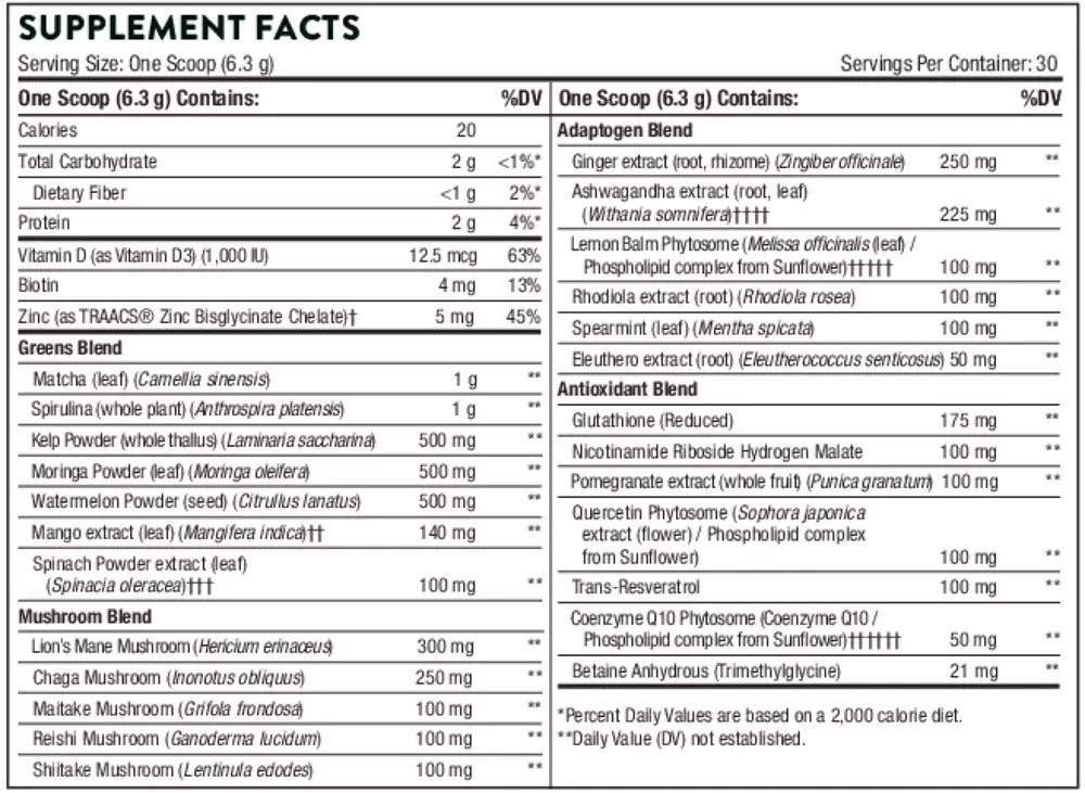 Thorne Daily Greens Plus – Greens Powder with Matcha, Spirulina & Moringa (Free Ship) Thorne Daily Greens Plus is a comprehensive greens powder designed to support overall health, brain function, and healthy aging. This formula combines high-quality greens, adaptogens, mushroom blend , and antioxidants to boost immunity, support stress response, and protect cells from oxidative damage. Key Benefits: Supports immune system and antioxidant defense Promotes healthy stress response and adrenal function Provides foundational nutrition for overall wellness Featured Ingredients: Matcha, Spirulina, Moringa, Kelp, Spinach, Watermelon, Mango leaf, Lion’s Mane, Chaga, Maitake, Reishi, Shiitake, Ashwagandha, Rhodiola, Eleuthero, Lemon Balm, Spearmint, Ginger, Glutathione, Nicotinamide Riboside, Pomegranate, Quercetin, Resveratrol, CoQ10, Betaine. Suggested Use: Shake before use. Mix 1 scoop (6.4 g) with at least 12 oz of water or your favorite beverage daily. Other Info: Flavor: Mint Gluten Free | NSF Certified for Sport Warnings : Not for use if pregnant, nursing, or trying to conceive. May contain chemicals known to the State of California to cause birth defects or reproductive harm.