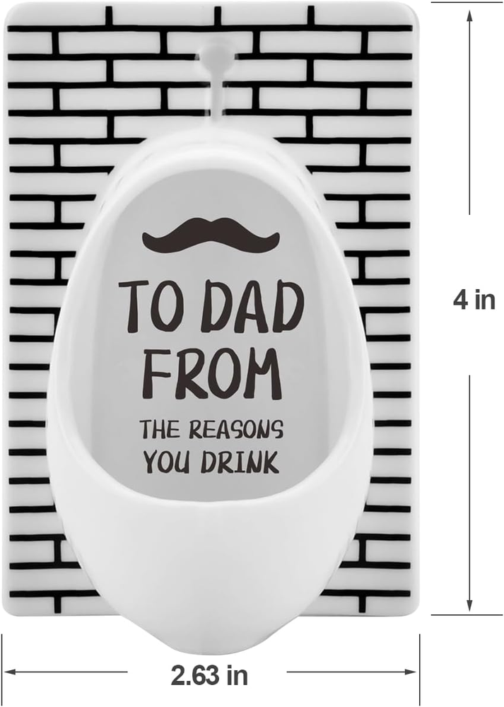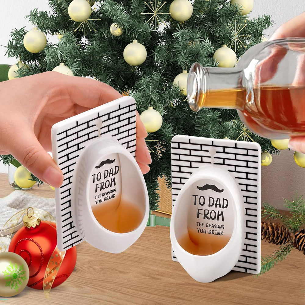 Fathers Day Dad Gifts for Dad: Include set of 2 urinal shot glasses, made of ceramic, durable. White Elephant Gifts: Designed with the shape of a mini urinal, 2.63in*4in. These funny gifts shot glasses are the secret santa gifts for Christmas party, White Elephant party or any day which is special for you. Easy Clean: Easy to clean, can wash in the dishwasher. Novelty Gag Gifts for Men Shot Glasses: This pair of urinal shot glasses novelty and unique design is sure to bring smile and catching your family members off-guard with this funny gifts at the party. Perfect Funny Gifts Stocking Stuffers: Perfect as funny adult gag gifts, white elephant gifts, Santa Christmas party, birthday gifts. Product Description Fathers Day Dad Gifts Urinal Shot Glasses This pair of urinal shot glasses novelty and unique design is sure to bring smile and catching your family members off-guard with this funny gifts at the party. FATHERS DAY GIFTS FOR DAD Made of ceramic Shape like ceramic urinal SET OF 2 FUNNY GAG GIFTS Include set of 2 urinal shot glasses As father's day gifts for dad from daughter or son or wife GIFTS FOR MEN DAD Hold whiskey, vodka, tequila, liqueur and beer etc. Perfect as fathers day gifts, dad husband gifts, funny adult gag gifts, white elephant gifts, party, Christmas stocking stuffers and birthday gifts