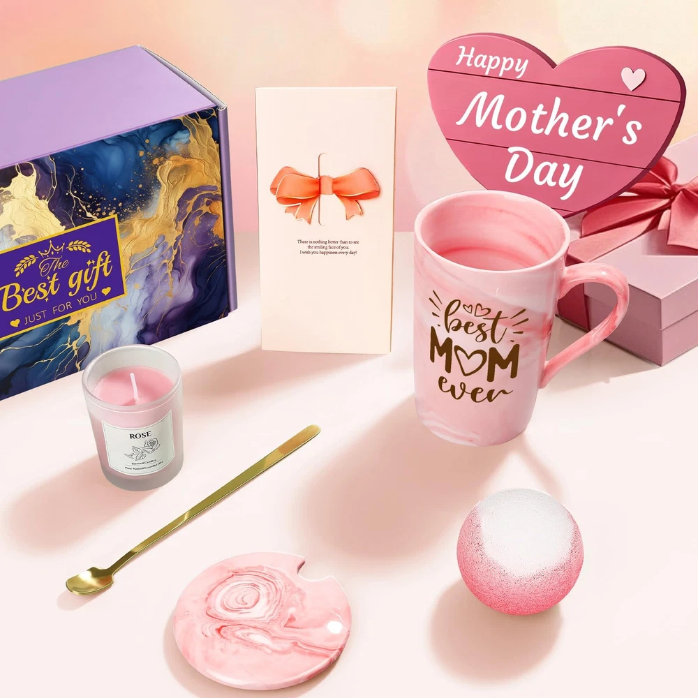 Birthday Gifts for Women Mom: Relaxing Spa Gift Baskets for Women, Christmas Gifts for Women Best Friend Mom Grandma Wife Sister Elegant Mom Gifts: Embracing the essence of elegance and sentimentality, unveils its exquisite collection of relaxation and self care gifts, tailored to enchant the hearts of mom for birthdays, Christmas, Mothers day, and every special occasion. Sincerely convey your heartfelt wishes, boundless love, and passionate affection to your mom with our personalized gift set. Imagine the twinkle in her eyes and the warm smile on her face as she unwraps this thoughtful surpris Luxurious Mom Gift Basket: The exquisite luxury box and every item within, thoughtfully designed and meticulously selected by , are intended to ignite happiness and warmth in the heart of the recipient. Each gift basket includes 1 mug, 1 scented candle, 1 bath ball, and 1 greeting card. It will be a great surprise for mom the moment she opens the box Best Mom Ever Gifts: This gift set includes a premium 'Best Mom Ever' coffee mug with a gold spoon, crafted from high-quality ceramic and adorned with safe, durable paint. The thoughtful words etched on the mug will surely melt her heart and remind her of her invaluable role. Express your gratitude and love with this meaningful and heartwarming mom gift basket Unique Gifts for Mom: Celebrate your love for mom with this unique and heartfelt gift. Perfect for mom, grandma, stepmom, mother-in-law, or a new mom. Surprise her with a gift that's as special as she is, whether it's for Mothers day or her birthday Perfect Gift Ideas for Mom:Arriving in a beautifully designed gift basket, ready for gifting without the need for repackaging. The gift set comes with a lovely greeting card, where you can pen down your heartwarming wishes, expressing your love and appreciation to your mom. Perfect for Mothers day gifts for mom, mom birthday gifts
