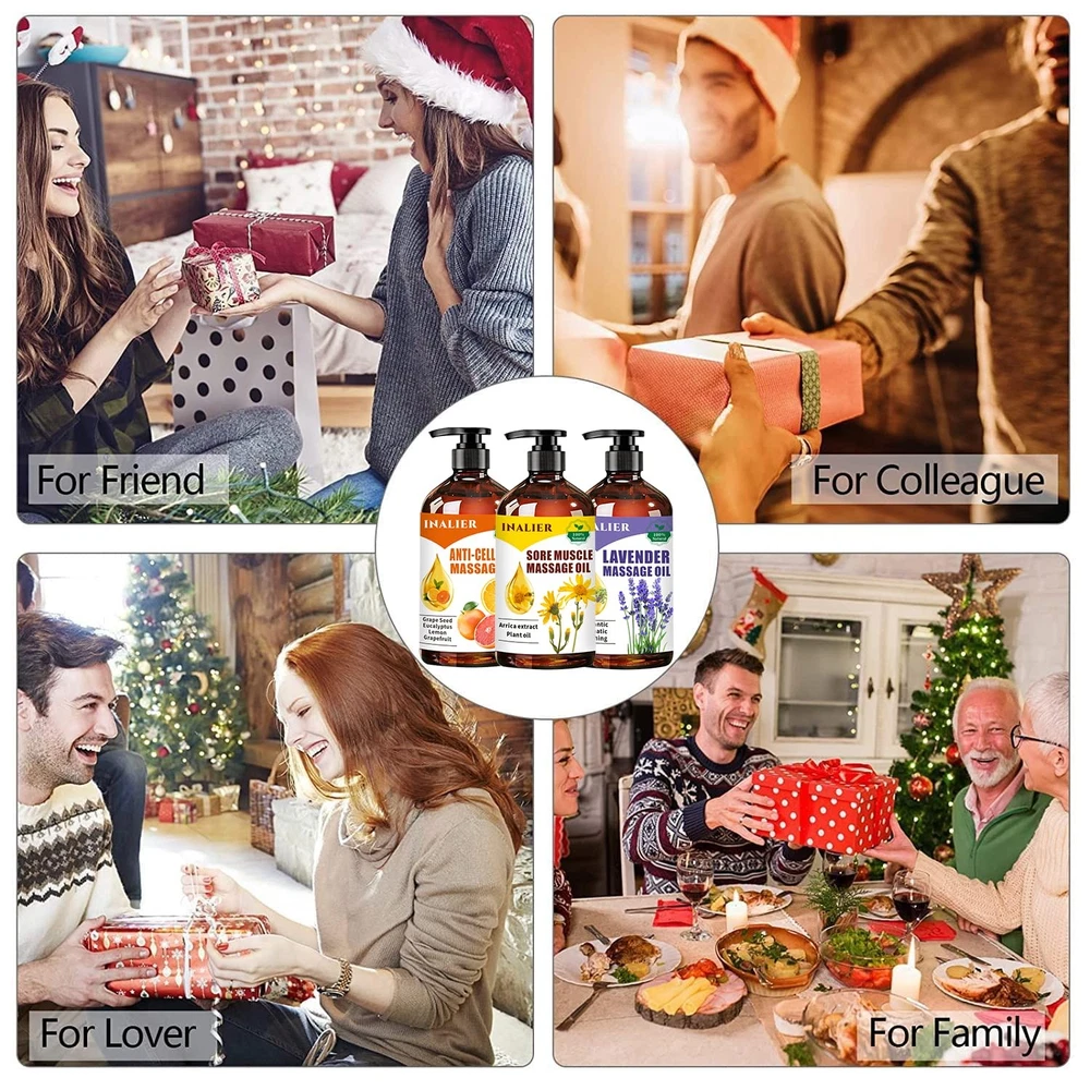 3 Pack Cellulite, Sore Muscle & Lavender Relaxation Massage Oils with Roller Massage Ball - Perfect Spa Treatment Gift Set.Natural Massage Oils for Valentines Day Gifts. Massage Oil for Massage Therapy. Anti-Cellulite Massage Oil:Massage Oil for Massage Therapy Crafted with a unique blend of beneficial ingredients. Eucalyptus and grapefruit essential oils together with grapeseed oil greatly contributes to our massage oil’s moisturizing skin properties.will help moisturize,tone cellulite from your abdomen, thighs, and legs. Minimize the look of cellulite and relax sore muscles Sore Muscle Massage Oil:Arnica extract help to relax sore muscles.Plant Oil contribute to this massage oil’s deeply moisturizing, and hydrating properties.The natural, soothing aroma combined with the lightweight, silky smooth, non-greasy qualities of our massage oil make it a perfect addition to your body care routine. Our body treatment oil is also easily and effectively absorbed in the skin without leaving any greasy residue Lavender Massage Oil:Massage Oils for Date Night lavender oil carefully crafted with wonderful ingredients such as Lavender Essential Oil, Grapeseed Oil to create a romantic aroma. Therapy massage oil largely used in massage and aromatherapy. Great for professional or at home massage. Best for Bath, Spa,Massage, GuaSha, Hair Care, Moisturize the skin. It is well-known as soothing,warming comforts the skin,body SPA Quality Massage Ball Roller:Massage ball is unique in its 360-degree spin design which allows it to glide on the skin and smooth any knots or tension. Just add a few drops of massage oil and enjoy a soothing, relaxing massage at any time.This quality roller ball is also designed to use for sore head, shoulders, neck, upper back, arms, legs and foot tried Wonderful Gift Set For Any Occasions:The Body Oil Gifts Sets ideal present for Christmas, Father's Day,Mother's Day, Birthdays and Anniversaries. A unique gift for men and women,husband,wife,parents,sisters,grandma,mom,lover or even yourself. A wonderful massage oils for date night relaxing massage experience for all of you