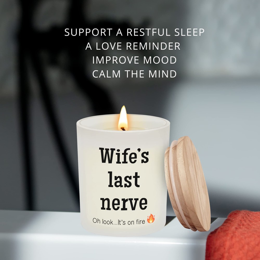 GIFTS FOR WIFE FROM HUSBAND: Let this scented candle show your affection humorously to your wife and remind her how much you love & care for her. Suitable for Birthday such as birthday gifts for wife from husband, wife birthday gifts from husband, birthday gift for wife, gifts for her birthday, birthday gifts for her, Mothers Day Gifts for Wife, or Valentine's Day such as valentine day gift for wife, valentine gifts for wife, valentines day gifts for her wife, valentines day for wife, valentines gifts for wife ... ANNIVERSARY GIFT FOR HER: Treat your wife to a candle and a smile. Ideal for romantic gifts for her on anniversary, wedding anniversary gifts for wife, anniversary gifts for her, wife anniversary gifts for her, anniversary gift for wife like 10 year anniversary gifts for her, 5 year anniversary gifts for her, 2 year anniversary gift for her... SWEET LAVENDER SCENT: This Valentine for Wife Candle is a light and lovely way to relax. It's scented with lavender essential oils, whose calming qualities are well suited for what ails you: stress, depression, insomnia. The soft fragrance will make your room full of faint fragrances and smell clean and fresh. 45-50 HOURS BURNING TIME: Our 100% premium soy wax melts evenly and consistently thanks to a lead-free wick. This candle burns for approximately 45-50 hours, giving you plenty of time to enjoy the warm light, fresh scent and peaceful atmosphere. MULTIPURPOSE USE: Lighting this candle can create a calm, relaxing environment, a lovely companion to home relaxation and morning yoga flow. After full use, this candle jar can be used for home decor and is also suitable for placing your small objects.