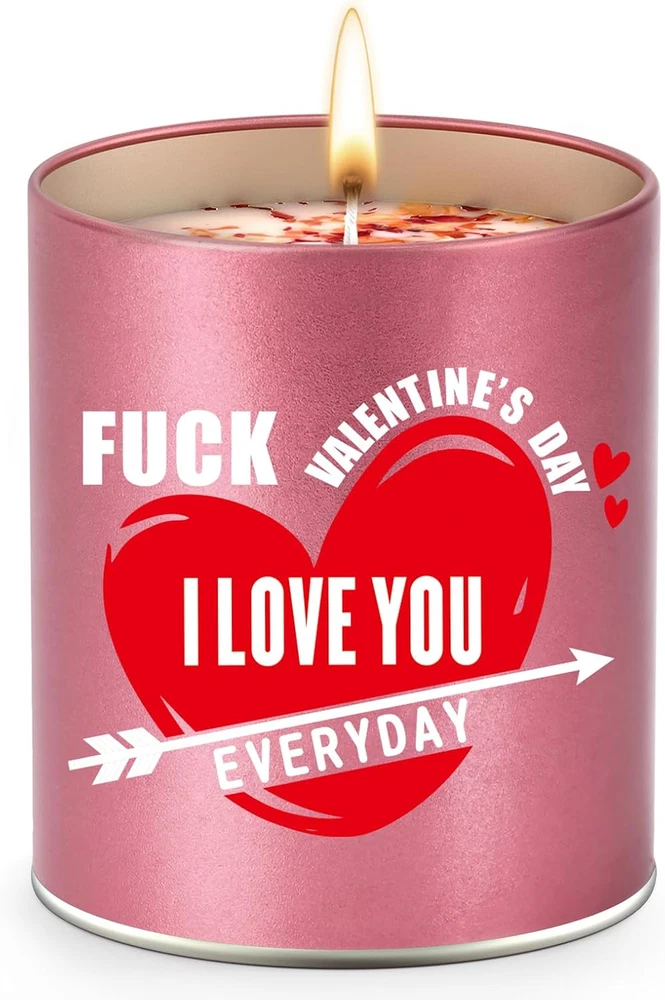 VALENTINES DAY GIFTS: This scented candle gifts with funny humorous quote,unique best gifts idea for her on Valentines Day wedding or birthday. VALENTINES GIFTS/DECOR FOR ANY OCCASIONS: Specially made scented candle gifts with rich fragrance for her,wife,she,Christmas,Valentines Day,wedding or birthday,gag gifts,anniversary gifts/decorations from him,is the great addition to the home. NATURAL WAX: Scented candle is made of quality wax,using 95% natural pure quality wax and 5% essential oil,which can provide natural health and fresh aroma for a long time. SIZE AND BURN TIME: 9 ounces and can burn for about 55-60 hours.The candle wick is lead-free and will not produce black smoke when ignited,clean the jar with hot soapy water can be recyclable. PERSONALIZED DESIGN: I LOVE YOU EVERYDAY.Funny text is printed on one side of the tin can,combined with the unique surface pattern design,unique gifts ideas for her who has everything. Product Description Valentines Day Gifts for Her Women Wife Girlfriend Specially made scented candle with rich fragrance and lovely packaging is the perfect choice for her girlfriend wife women as a Valentines Day birthday. 9 ounces and can burn for about 55-60 hours. Valentines Day decorations/decor. Great gift idea Funny text is printed on one side of the tin can,combined with the unique surface pattern design,it is perfect to express your romantic love with this canned candle as a gift. Easy to clean, just wash the jar with hot soapy water after the candle burns. The empty jar can be used for many purposes. It can be planted with small green plants or used as a container for small tools, which is very practical. Handcrafted Soy wax candles are longer lasting,made of 100% natural soy wax with essential oil and cotton lead-free wick.