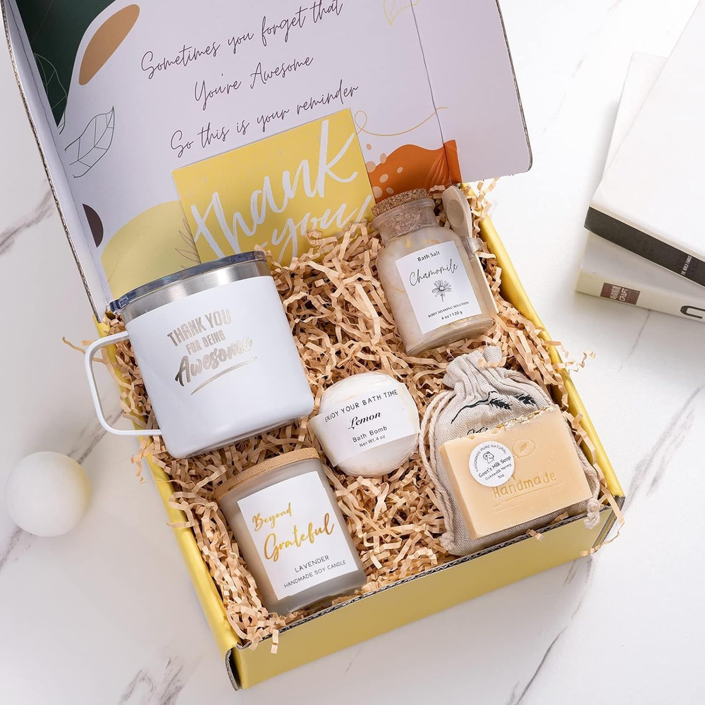 Store New Arrivals Add to Favorite View Feedback Contact Thank You Gifts for Women Spa Thoughtful Unique Office Gifts Valentines Day Gifts for Coworker Nurse Friends Men Boss Employee Secretary Hostess Teacher Mom Her Appreciation Gift Boxes Holiday Gift Description Color White & Yellow Number Of Pieces 7 Package Dimensions 8.66 x 8.31 x 4.37 inches; 2.43 Pounds THOUGHTFUL THANK YOU GIFT BOX & PERSONALIZED MESSAGE - Our handmade gift set is beautifully designed. No need to repackage. Show your gratitude and appreciation with a perfect gift. PLEASE CHECK "Add a gift receipt" to add your free personalized message. Thanksgiving Gift Box,Valentines Day Gifts, Valentines Gifts for Women, Mother day gifts, mother s day gifts for mom, mother day gifts from daughter. AN UNFORGETTABLE UNBOXING - This Thank You for Being Awesome gift basket contains 7 gifts: a 10 oz insulated stainless steel coffee tumbler, a scented candle, bath salt ball, pure manual bath salt, a handmade bar soap, a soap bag and a thank you card GREAT THANK YOU GIFT IDEAS - Whether you're looking for appreciation gifts for best friend, sister, brother, wife, husband, girlfriend, boyfriend, coworker, boss, employee, dad, mom, daughter, son, teacher, coach mentor or nurse, the relaxing gift box is the best choice. FITS FOR VARIOUS OCCASIONS - This is a perfect gift choice for that someone special who has made a difference in your life. No matter on Valentines Day, Birthday, Valentines Day, Thanksgiving Day, Mother's Day, Father's Day, Teacher's Day, Wedding, Baby Shower, Bridal Shower, Leaving Work, Going Away or Congratulations. Great anniversary gift for her, anniversary gifts for him, gifts for men, cool gifts for dad, graduation gifts, teacher appreciation gifts, holiday gifts. INDIVIDUAL DESIGN - The coffee mug with the words "THANK YOU FOR BEING AWESOME" is constructed of stainless steel and double insulated design can keep your drinks warm for 2 hours and cold for 8 hours. Handle is also made of stainless steel, and the design is ergonomic so large or small hands are comfortable to hold. It is perfect for wine, coffee, tea, juice, beer and cocktails. Product Description APPRECIATION GIFTS FOR YOUR FAMILY AND FRIENDS PERSONALIZED THANK YOU GIFTS IDEARS FOR WOMEN AND MEN COFFEE MUG Enjoy coffee and feel warm in heart. SOY CANDLE Feel comfortable in the fragrance. GRATITUDE SET BATH SALT Refresh every cell of body. BATH SALT BALL Enjoy a relaxing bathing time. BAR SOAP Keep skin smooth and moisturized. SENDING A THOUGHFUL AND LASTING THANK YOU GIFTS Coffee Mug x1 Lavender Scented Candle x1 Handmade Soap x1 Soap Bag x1 Bath Salt Ball x1 Bath Salt x1 Thank You Card x1 ABOUT US We offer the best prices around on high quality products. Our E-store includes media such as books, movies, music and games while offering electronics, toys, sporting apparel, clothing, tools, general home, garden items and more. SHIPPING We are always working hard to ensure your package arrives as soon as possible. Please understand that some factors like weather, high postal traffic, and the performance of shipping companies are outside of our control. We offer free shipping to the lower 48 states and ship within 1 business day of payment, usually sooner. P.O. Boxes are accepted, so please feel free to provide either a physical address or a P.O. Box. We do not offer shipping outside of the continental USA. We only ship to states within the continental United States. RETURNS We offer a 30-Day Return Policy on items which you are not completely satisfied with. You have the option for a full-refund or an exchange of the item. No returns are available on items shipped outside of the USA. PAYMENT We accept PayPal. CONTACT US This page content is yet to come Please ad us to your favorite seller and visit again later Thank You CUSTOMER SATISFACTION We try our very best to make sure every customer is completely satisfied. If there's a problem, message us! We're happy to help.