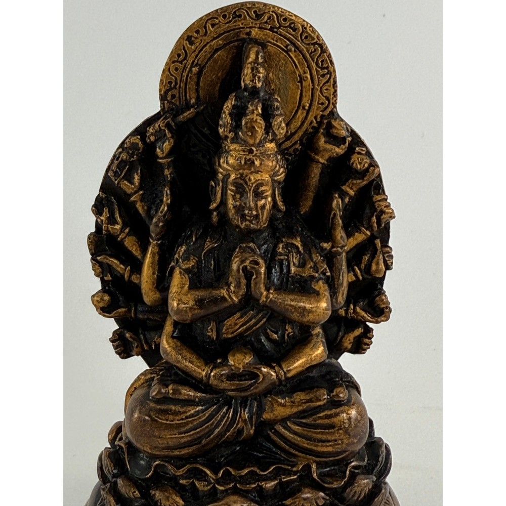 Size: 4.5" Bronze/Black Resin Thousand Armed Kwan-Yin The Bodhisattva of Compassion is here shown with many arms with which to help beings in need, and with multiple heads which can see in all directions in order to identify need and provide help. Avalokiteshwara Kanzeon Kwan Yin Quan Yin